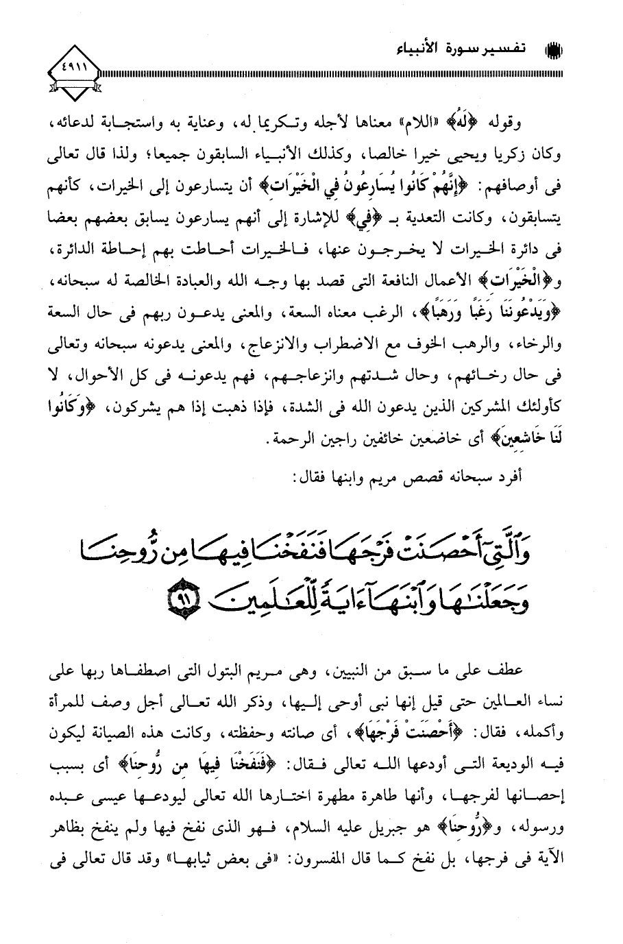 عطف على ما سبق من النبيين، وهي مريم البتول التي اصطفاها ربها على نساء العالمين حتى قيل إنها نبي أُوحي إليها، وذكر الله تعالى أجل وصف للمرأة وأكمله، فقال: (أَحْصَنَتْ فَرْجَهَا)، أي صانته وحفظته، وكانت هذه الصيانة ليكون فيه الوديعة التي أودعها الله تعالى فقال: (فَنَفَخْنَا فِيهَا مِنْ رُوحِنَا) أي بسبب إحصانها لفرجها، وأنها طاهرة مطهرة اختارها الله تعالى ليودعها عيسى عبده ورسوله، و (رُوحِنَا) هو جبريل عليه السلام، فهو الذي نفخ فيها ولم ينفخ بظاهر الآية في فرجها، بل نفخ كما قال المفسرون: " فى بعض ثيابها "، وقد قال تعالى في