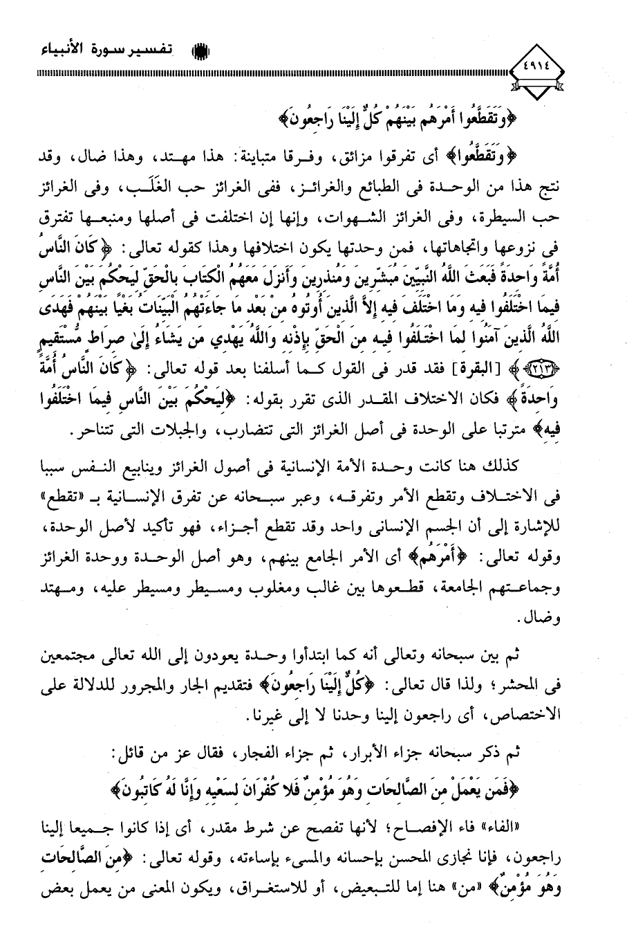 (وَتَقَطَّعُوا) أي تفرقوا مزائق، وفرقا متباينة: هذا مهتد، وهذا ضال، وقد نتج هذا من الوحدة في الطبائع والغرائز، ففي الغرائز حب الغَلَب، وفي الغرائز حب السيطرة، وفي الغرائز الشهوات، وإنها إن اختلفت في أصلها ومنبعها تفترق فى نزوعها واتجاهاتها، فمن وحدتها يكون اختلافها وهذا كقوله تعالى: (كَانَ النَّاسُ أُمَّةً وَاحِدَةً فَبَعَثَ اللَّهُ النَّبِيِّينَ مُبَشِّرِينَ وَمُنْذِرِينَ وَأَنْزَلَ مَعَهُمُ الْكِتَابَ بِالْحَقِّ لِيَحْكُمَ بَيْنَ النَّاسِ فِيمَا اخْتَلَفُوا فِيهِ وَمَا اخْتَلَفَ فِيهِ إِلَّا الَّذِينَ أُوتُوهُ مِنْ بَعْدِ مَا جَاءَتْهُمُ الْبَيِّنَاتُ بَغْيًا بَيْنَهُمْ فَهَدَى اللَّهُ الَّذِينَ آمَنُوا لِمَا اخْتَلَفُوا فِيهِ مِنَ الْحَقِّ بِإِذْنِهِ وَاللَّهُ يَهْدِي مَنْ يَشَاءُ إِلَى صِرَاطٍ مُسْتَقِيمٍ (213)، فقد قدر في القول كما أَسَلفنا بعد قوله تعالى: (كَانَ الناسُ أُمَّةً وَاحِدَةً) فكان الاختلاف المقدر الذي تقرر بقوله: (لِيَحْكُمَ بَيْنَ النَّاسِ فِيمَا اخْتَلَفُوا) فِيهِ مترتبا على الوحدة في أصل الغرائز التي تتضارب، والجبلات التي تتناحر.
