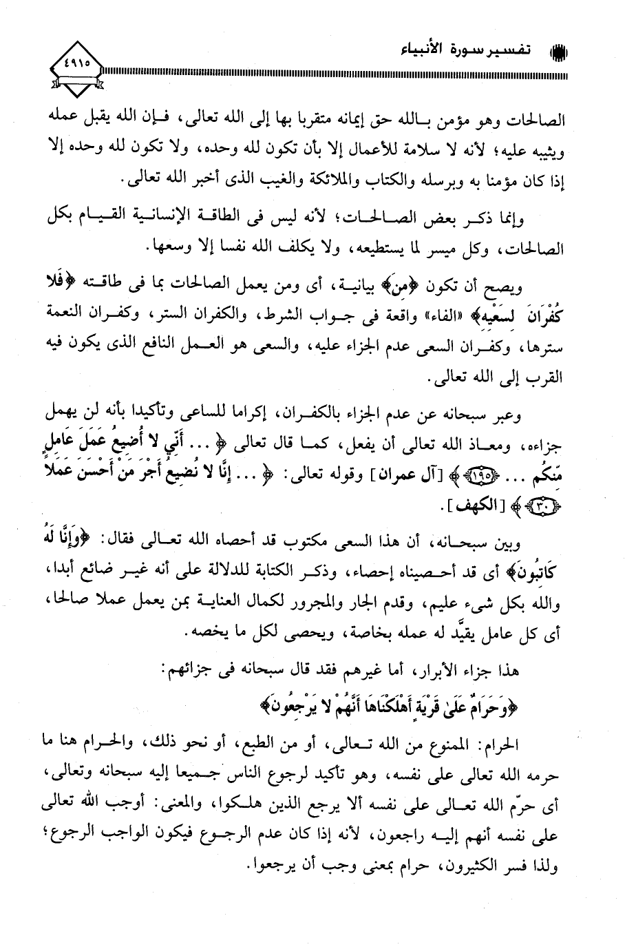 ويصح أن تكون (مِنَ) بيانية، أي ومن يعمل الصالحات بما في طاقته (فَلا كفْرَانَ لِسَعْيِهِ) " الفاء " واقعة في جواب الشرط، والكفران الستر، وكفران النعمة سترها، وكفران السعي عدم الجزاء عليه، والسعي هو العمل النافع الذي يكون فيه القرب إلى الله تعالى.