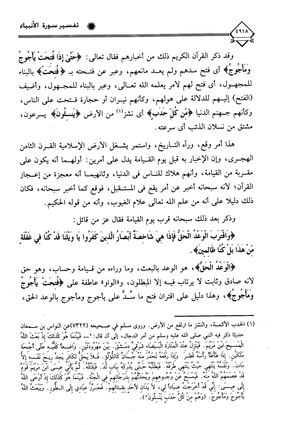 (¬1) الحدب الأكمة، والنشز ما ارتفع من الأرض. وروى مسلم في صحيحه (7322) عن النواس بن سمعان حديثا ذكر فيه النبي صلى الله عليه وسلم من أمر الدجال، إلى أن قال: ". . . فَبَيْنَمَا هُوَ كَذَلِكَ إِذْ بَعَثَ اللهُ الْمَسِيحَ ابْنَ مَرْيَمَ، فَيَنْزِلُ عِنْدَ الْمَنَارَةِ الْبَيْضَاءِ شَرْقِيَّ دِمَشْقَ، بَيْنَ مَهْرُودَتَيْنِ، وَاضِعًا كَفَّيْهِ عَلَى أَجْنِحَةِ مَلَكَيْنِ، إِذَا طَأْطَأَ رَأْسَهُ قَطَرَ، وَإِذَا رَفَعَهُ تَحَدَّرَ مِنْهُ جُمَانٌ كَاللُّؤْلُؤِ، فَلَا يَحِلُّ لِكَافِرٍ يَجِدُ رِيحَ نَفَسِهِ إِلَّا مَاتَ، وَنَفَسُهُ يَنْتَهِي حَيْثُ يَنْتَهِي طَرْفُهُ، فَيَطْلُبُهُ حَتَّى يُدْرِكَهُ بِبَابِ لُدٍّ، فَيَقْتُلُهُ، ثُمَّ يَأْتِي عِيسَى ابْنَ مَرْيَمَ قَوْمٌ قَدْ عَصَمَهُمُ اللهُ مِنْهُ، فَيَمْسَحُ عَنْ وُجُوهِهِمْ وَيُحَدِّثُهُمْ بِدَرَجَاتِهِمْ فِي الْجَنَّةِ، فَبَيْنَمَا هُوَ كَذَلِكَ إِذْ أَوْحَى اللهُ إِلَى عِيسَى: إِنِّي قَدْ أَخْرَجْتُ عِبَادًا لِي، لَا يَدَانِ لِأَحَدٍ بِقِتَالِهِمْ، فَحَرِّزْ عِبَادِي إِلَى الطُّورِ وَيَبْعَثُ اللهُ يَأْجُوجَ وَمَأْجُوجَ، وَهُمْ مِنْ كُلِّ حَدَبٍ يَنْسِلُونَ ".