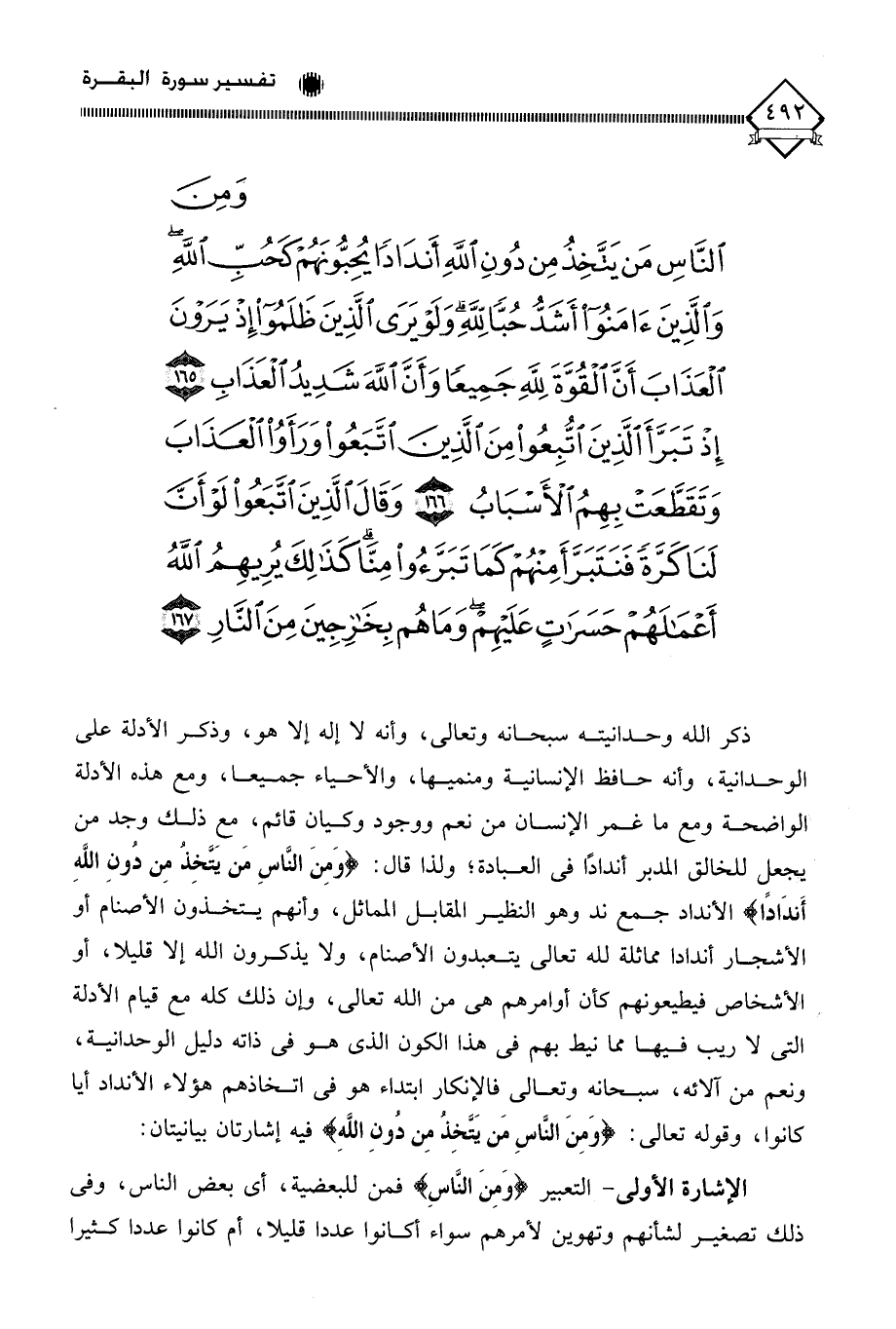 (وَمِنَ النَّاسِ مَنْ يَتَّخِذُ مِنْ دُونِ اللَّهِ أَنْدَادًا يُحِبُّونَهُمْ كَحُبِّ اللَّهِ وَالَّذِينَ آمَنُوا أَشَدُّ حُبًّا لِلَّهِ وَلَوْ يَرَى الَّذِينَ ظَلَمُوا إِذْ يَرَوْنَ الْعَذَابَ أَنَّ الْقُوَّةَ لِلَّهِ جَمِيعًا وَأَنَّ اللَّهَ شَدِيدُ الْعَذَابِ (165) إِذْ تَبَرَّأَ الَّذِينَ اتُّبِعُوا مِنَ الَّذِينَ اتَّبَعُوا وَرَأَوُا الْعَذَابَ وَتَقَطَّعَتْ بِهِمُ الْأَسْبَابُ (166) وَقَالَ الَّذِينَ اتَّبَعُوا لَوْ أَنَّ لَنَا كَرَّةً فَنَتَبَرَّأَ مِنْهُمْ كَمَا تَبَرَّءُوا مِنَّا كَذَلِكَ يُرِيهِمُ اللَّهُ أَعْمَالَهُمْ حَسَرَاتٍ عَلَيْهِمْ وَمَا هُمْ بِخَارِجِينَ مِنَ النَّارِ (167)