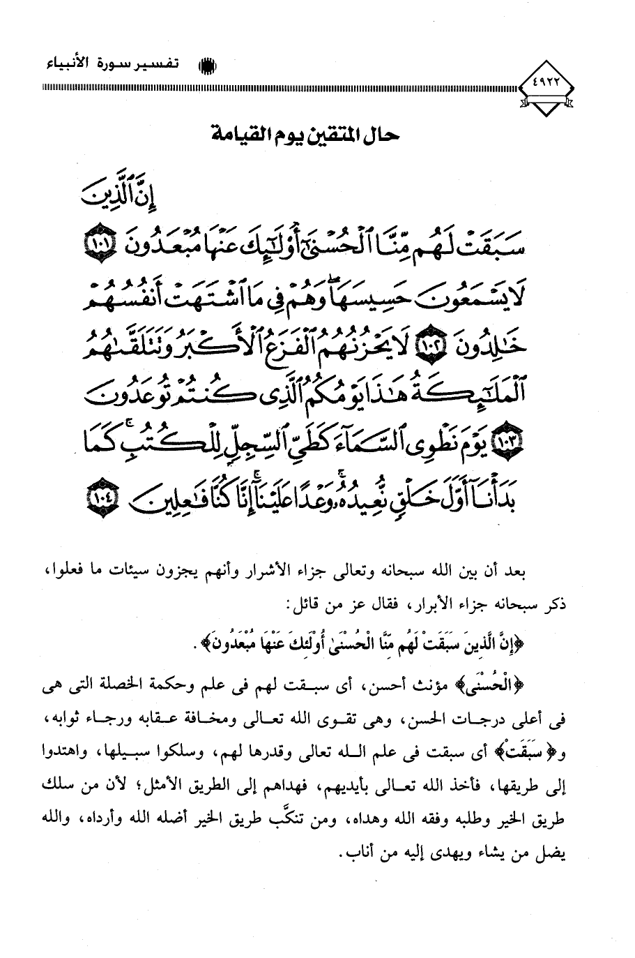 (إِنَّ الَّذِينَ سَبَقَتْ لَهُمْ مِنَّا الْحُسْنَى أُولَئِكَ عَنْهَا مُبْعَدُونَ (101) لَا يَسْمَعُونَ حَسِيسَهَا وَهُمْ فِي مَا اشْتَهَتْ أَنْفُسُهُمْ خَالِدُونَ (102) لَا يَحْزُنُهُمُ الْفَزَعُ الْأَكْبَرُ وَتَتَلَقَّاهُمُ الْمَلَائِكَةُ هَذَا يَوْمُكُمُ الَّذِي كُنْتُمْ تُوعَدُونَ (103) يَوْمَ نَطْوِي السَّمَاءَ كَطَيِّ السِّجِلِّ لِلْكُتُبِ كَمَا بَدَأْنَا أَوَّلَ خَلْقٍ نُعِيدُهُ وَعْدًا عَلَيْنَا إِنَّا كُنَّا فَاعِلِينَ (104)