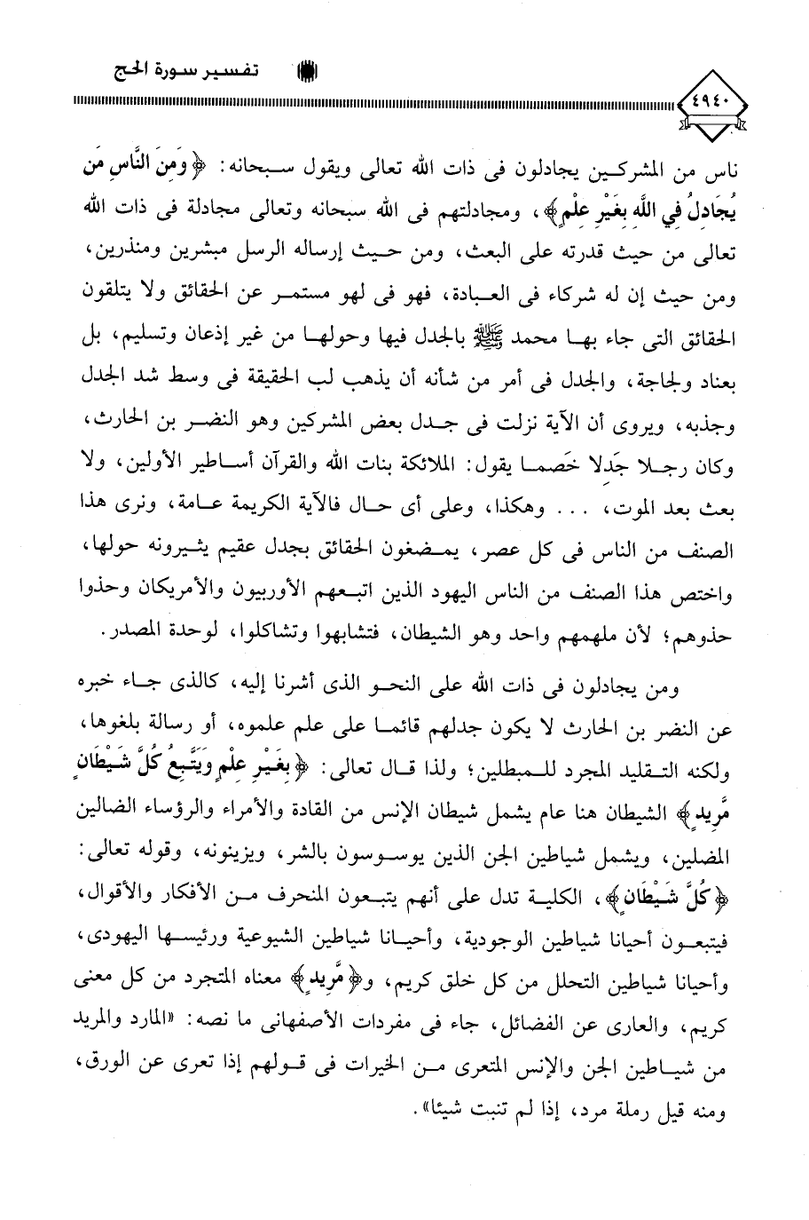ناس من المشركين يجادلون في ذات اللَّه تعالى ويقول سبحانه: (وَمِنَ النَّاسِ مَن يُجَادِلُ فِي اللَّهِ بِغَيْرِ عِلْمٍ)، ومجادلتهم في اللَّه سبحانه وتعالى مجادلة في ذات اللَّه تعالى من حيث قدرته على البعث، ومن حيث إرساله الرسل مبشرين ومنذرين، ومن حيث إن له شركاء في العبادة، فهو في لهو مستمر عن الحقائق ولا يتلقون الحقائق التي جاء بها محمد - صلى الله عليه وسلم - بالجدل فيها وحولها من غير إذعان وتسليم، بل بعناد ولجاجة، والجدل في أمر من شأنه أن يذهب لب الحقيقة في وسط شد الجدل وجذبه، ويروى أن الآية نزلت في جدل بعض المشركين وهو النضر بن الحارث، وكان رجلا جَدِلا خَصما يقول: الملائكة بنات اللَّه والقرآن أساطير الأولين، ولا بعث بعد الموت،. . . وهكذا، وعلى أي حال فالآية الكريمة عامة، ونرى هذا الصنف من الناس في كل عصر، يمضغون الحقائق بجدل عقيم يثيرونه حولها، واختص هذا الصنف من الناس اليهود الذين اتبعهم الأوربيون والأمريكان وحذوا حذوهم؛ لأن ملهمهم واحد وهو الشيطان، فتشابهوا وتشاكلوا، لوحدة المصدر.
