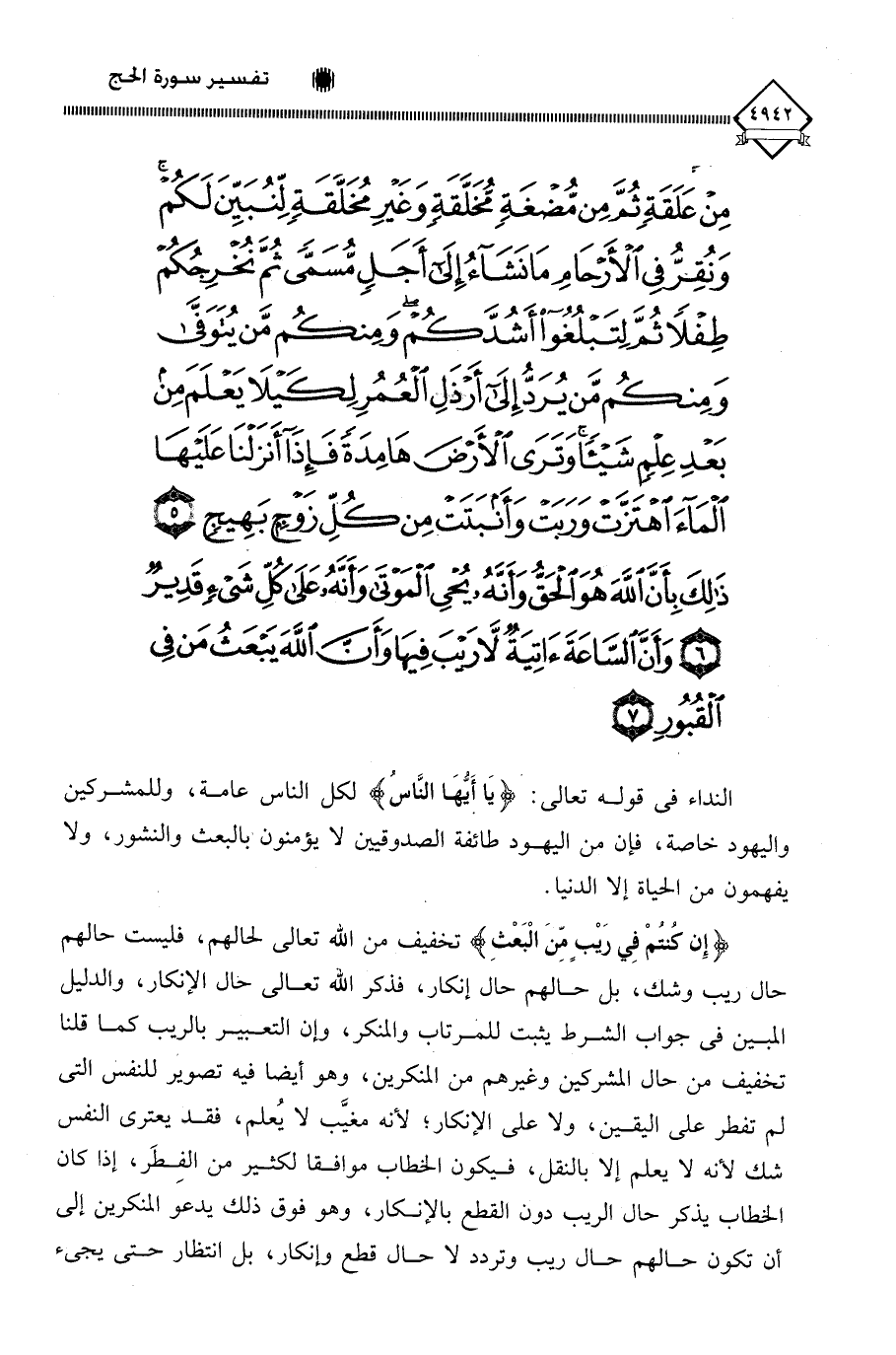 مِنْ عَلَقَةٍ ثُمَّ مِنْ مُضْغَةٍ مُخَلَّقَةٍ وَغَيْرِ مُخَلَّقَةٍ لِنُبَيِّنَ لَكُمْ وَنُقِرُّ فِي الْأَرْحَامِ مَا نَشَاءُ إِلَى أَجَلٍ مُسَمًّى ثُمَّ نُخْرِجُكُمْ طِفْلًا ثُمَّ لِتَبْلُغُوا أَشُدَّكُمْ وَمِنْكُمْ مَنْ يُتَوَفَّى وَمِنْكُمْ مَنْ يُرَدُّ إِلَى أَرْذَلِ الْعُمُرِ لِكَيْلَا يَعْلَمَ مِنْ بَعْدِ عِلْمٍ شَيْئًا وَتَرَى الْأَرْضَ هَامِدَةً فَإِذَا أَنْزَلْنَا عَلَيْهَا الْمَاءَ اهْتَزَّتْ وَرَبَتْ وَأَنْبَتَتْ مِنْ كُلِّ زَوْجٍ بَهِيجٍ (5) ذَلِكَ بِأَنَّ اللَّهَ هُوَ الْحَقُّ وَأَنَّهُ يُحْيِ الْمَوْتَى وَأَنَّهُ عَلَى كُلِّ شَيْءٍ قَدِيرٌ (6) وَأَنَّ السَّاعَةَ آتِيَةٌ لَا رَيْبَ فِيهَا وَأَنَّ اللَّهَ يَبْعَثُ مَنْ فِي الْقُبُورِ (7)