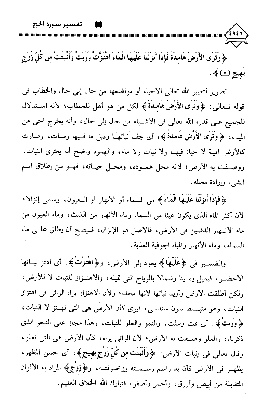 والضمير في (عَلَيْهَا) يعود إلى الأرض، و (اهْتَزَّتْ)، أي اهتز نباتها الأخضر، فيميل يمينا وشمالا بالرياح التي تميله، والاهتزاز للنبات لَا للأرض، ولكن أطلقت الأرض وأريد نباتها لأنها محله؛ ولأن الاهتزاز يراه الرائي في اهتزاز النبات، وهو منبسط بلون سندسي، فيرى كأن الأرض هي التي تهتز لَا النبات، (وَرَبَتْ): أي نمت وعلت، والنمو والعلو للنبات، وهذا مجاز على النحو الذي ذكرناه، والعلو وصفت به الأرض؛ لأن الرائي يراه، كأن الأرض هي التي تعلو، وقال تعالى في إنبات الأرض: (وَأَنْبَتَتْ مِن كُل زَوْج بَهِيج)، أي حسن المظهر، يظهر في الأرض كأن يد راسم رسمته وزخرفته، و (زَوْج) المراد به الألوان المتقابلة من أبيض وأزرق، وأحمر وأصفر، فتبارك اللَّه الخلاق العليم.