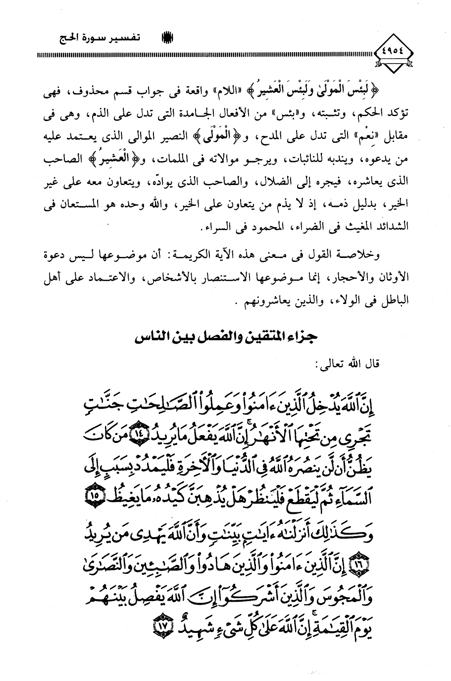 (إِنَّ اللَّهَ يُدْخِلُ الَّذِينَ آمَنُوا وَعَمِلُوا الصَّالِحَاتِ جَنَّاتٍ تَجْرِي مِنْ تَحْتِهَا الْأَنْهَارُ إِنَّ اللَّهَ يَفْعَلُ مَا يُرِيدُ (14) مَنْ كَانَ يَظُنُّ أَنْ لَنْ يَنْصُرَهُ اللَّهُ فِي الدُّنْيَا وَالْآخِرَةِ فَلْيَمْدُدْ بِسَبَبٍ إِلَى السَّمَاءِ ثُمَّ لْيَقْطَعْ فَلْيَنْظُرْ هَلْ يُذْهِبَنَّ كَيْدُهُ مَا يَغِيظُ (15) وَكَذَلِكَ أَنْزَلْنَاهُ آيَاتٍ بَيِّنَاتٍ وَأَنَّ اللَّهَ يَهْدِي مَنْ يُرِيدُ (16) إِنَّ الَّذِينَ آمَنُوا وَالَّذِينَ هَادُوا وَالصَّابِئِينَ وَالنَّصَارَى وَالْمَجُوسَ وَالَّذِينَ أَشْرَكُوا إِنَّ اللَّهَ يَفْصِلُ بَيْنَهُمْ يَوْمَ الْقِيَامَةِ إِنَّ اللَّهَ عَلَى كُلِّ شَيْءٍ شَهِيدٌ (17)