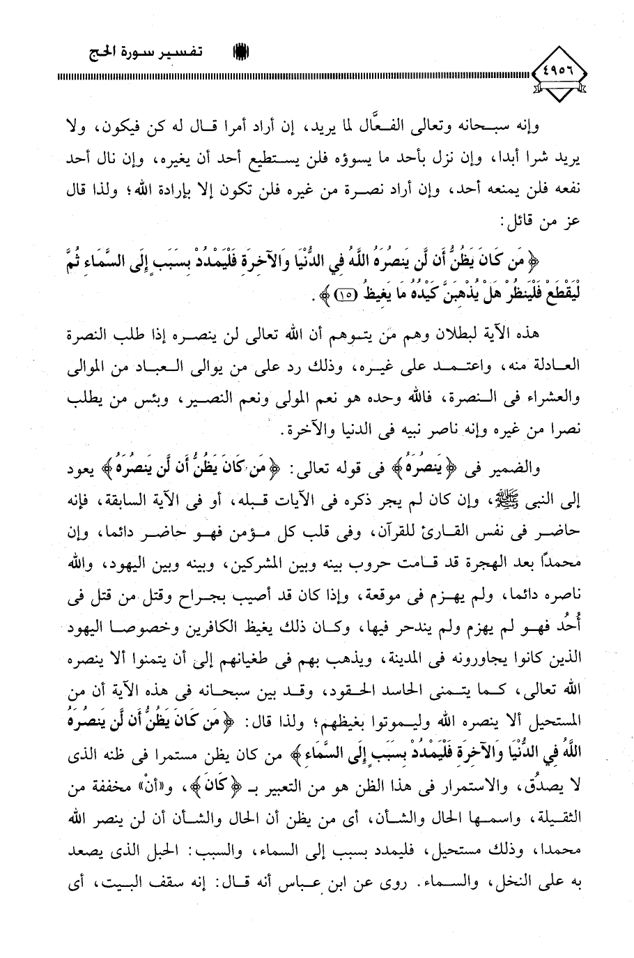 والضمير في (يَنصُرَهُ) في قوله تعالى: (مَنْ كَانَ يَظُنُّ أَنْ لَنْ يَنْصُرَهُ) يعود إلى النبي - صلى الله عليه وسلم - وإن كان لم يجر ذكره في الآيات قبله، أو في الآية السابقة، فإنه حاضر في نفس القارئ للقرآن، وفي قلب كل مؤمن فهو حاضر دائما، وإن محمدًا بعد الهجرة قد قامت حروب بينه وبين المشركين، وبينه وبين اليهود، واللَّه ناصره دائما، ولم يهزم في موقعة، وإذا كان قد أصيب بجراح وقتل من قتل في أُحُد فهو لم يهزم ولم يندحر فيها، وكان ذلك يغيظ الكافرين وخصوصا اليهود الذين كانوا يجاورونه في المدينة، ويذهب بهم في طغيانهم إلى أن يتمنوا ألا ينصره اللَّه تعالى، كما يتمنى الحاسد الحقود، وقد بين سبحانه في هذه الآية أن من المستحيل ألا ينصره اللَّه وليموتوا بغيظهم؛ ولذا قال: (مَن كَانَ يَظُنُّ أَن لَّن يَنصُره اللَّهُ فِي الدُّنْيَا وَالآخِرَةِ فَلْيَمْدُدْ بِسَبَبٍ إِلَى السَّمَاءِ) من كان يظن مستمرا في ظنه الذي لا يصدُق، والاستمرار في هذا الظن هو من التعبير بـ (كَانَ)، و " أنْ " مخففة من الثقيلة، واسمها الحال والشأن، أي من يظن أن الحال والشأن أن لن ينصر اللَّه محمدا، وذلك مستحيل، فليمدد بسبب إلى السماء، والسبب: الحبل الذي يصعد به على النخل، والسماء. روي عن ابن عباس أنه قال: إنه سقف البيت، أي
