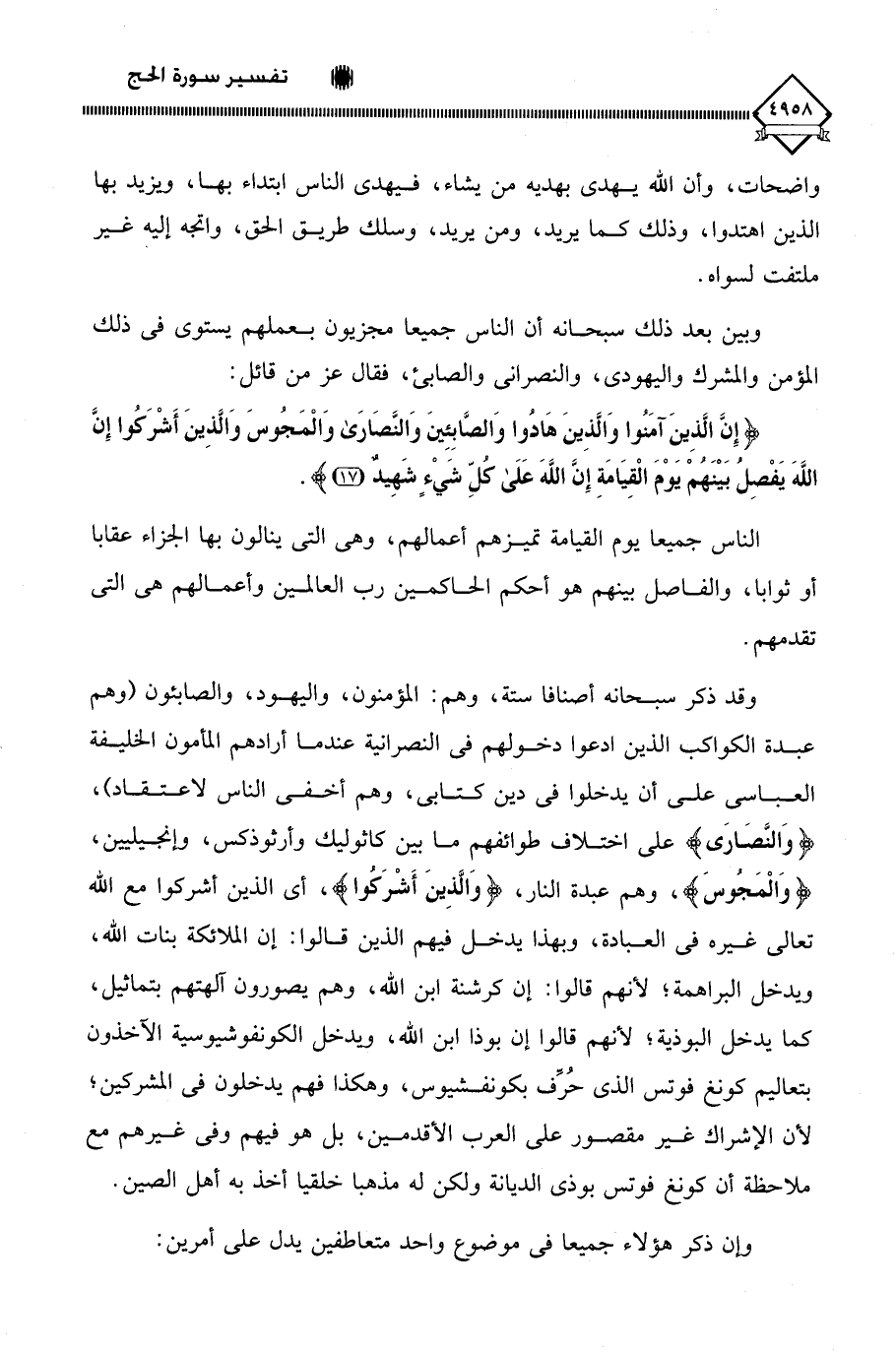 وقد ذكر سبحانه أصنافا ستة، وهم: المؤمنون، واليهود، والصابئون (وهم عبدة الكواكب الذين ادعوا دخولهم في النصرانية عندما أرادهم المأمون الخليفة العباسي على أن يدخلوا في دين كتابي، وهم أخفى الناس لاعتقاد)، (وَالنَّصَارَى) على اختلاف طوائفهم ما بين كاثوليك وأرثوذكس، وإنجيليين، (وَالْمَجُوسَ)، وهم عبدة النار، (وَالَّذِينَ أَشْرَكُوا)، أي الذين أشركوا مع اللَّه تعالى غيره في العبادة، وبهذا يدخل فيهم الذين قالوا: إن الملائكة بنات اللَّه، ويدخل البراهمة؛ لأنهم قالوا: إن كرشنة ابن اللَّه، وهم يصورون آلهتهم بتماثيل، كما يدخل البوذية؛ لأنهم قالوا إن بوذا ابن اللَّه، ويدخل الكونفوشيوسية الآخذون بتعاليم كونغ فوتس الذي حُرِّف بكونفشيوس، وهكذا فهم يدخلون في المشركين؛ لأن الإشراك غير مقصور على العرب الأقدمين، بل هو فيهم وفي غيرهم مع ملاحظة أن كونغ فوتس بوذي الديانة ولكن له مذهبا خلقيا أخذ به أهل الصين.
