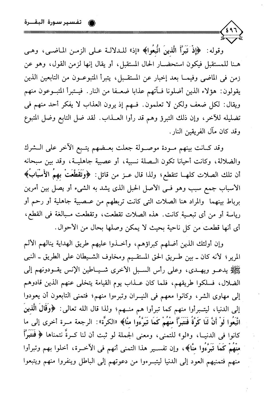 وقوله: (إِذْ تَبَرَّأَ الَّذِينَ اتُّبِعُوا) " إذ " للدلالة على الزمن الماضي، وهي هنا للمستقبل فيكون استحضار الحال المستقبل، أو يقال إنها لزمن القول، وهو عن زمن في الماضي وفيما بعد إخبار عن المستقبل، يتبرأ المتبوعون من التابعين الذين يقولون: هؤلاء الذين أضلونا فآتهم عذابا ضعفا من النار. فيتبرأ المتبوعون منهم ويقال: لكل ضعف ولكن لَا تعلمون. فهم إذ يرون العذاب لَا يفكر أحد منهم في تضليله للآخر، وإن ذلك التبرؤ وهم قد رأوا العذاب. لقد ضل التابع وضل المتبوع وقد كان مآل الفريقين النار.