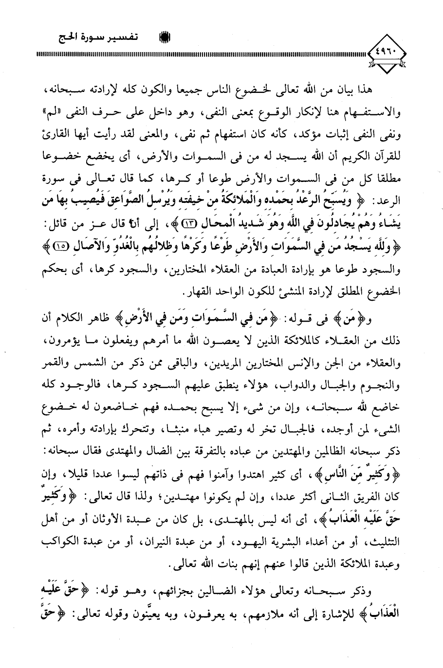 هذا بيان من اللَّه تعالى لخضوع الناس جميعا والكون كله لإرادته سبحانه، والاستفهام هنا لإنكار الوقوع بمعنى النفي، وهو داخل على حرف النفي " لم " ونفي النفي إثبات مؤكد، كأنه كان استفهام ثم نفي، والمعنى لقد رأيت أيها القارئ للقرآن الكريم أن اللَّه يسجد له من في السماوات والأرض، أي يخضع خضوعا مطلقا كل من في السماوات والأرض طوعا أو كرها، كما قال تعالى في سورِة الرعد: (وَيُسَبِّحُ الرَّعْدُ بِحَمْدِهِ وَالْمَلَائِكَةُ مِنْ خِيفَتِهِ وَيُرْسِلُ الصَّوَاعِقَ فَيُصِيبُ بِهَا مَنْ يَشَاءُ وَهُمْ يُجَادِلُونَ فِي اللَّهِ وَهُوَ شَدِيدُ الْمِحَالِ (13)، إلى أن قال عز من قائل: