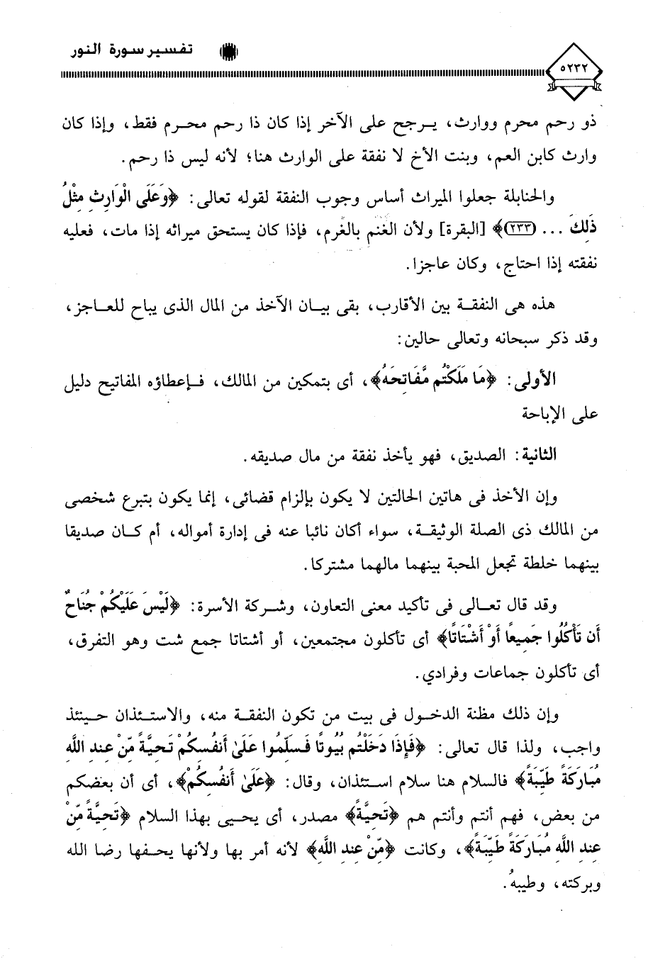 وإن ذلك مظنة الدخول في بيت من تكون النفقة منه، والاستئذان حينئذ واجب، ولذا قال تعالى: (فَإِذَا دَخَلْتُمْ بُيُوتًا فَسَلِّمُوا عَلَى أَنْفُسِكُمْ تَحِيَّةً مِنْ عِنْدِ اللَّهِ مُبَارَكَةً طَيِّبَةً) فالسلام هنا سلام استئذان، وقال: (عَلَى أَنفسِكَمْ)، أي أن بعضكم من بعض، فهم أنتم وأنتم هم (تَحِيَّةً) مصدر، أي يحيى بهذا السلام (تَحِيَّةً مِّن عِندِ اللَّهِ مُبَارَكَةً طَيِّبَةَ)، وكانت (مِّنْ عِندِ اللَّهِ) لأنه أمر بها ولأنها يحفها رضا الله وبركته، وطيبهُ.