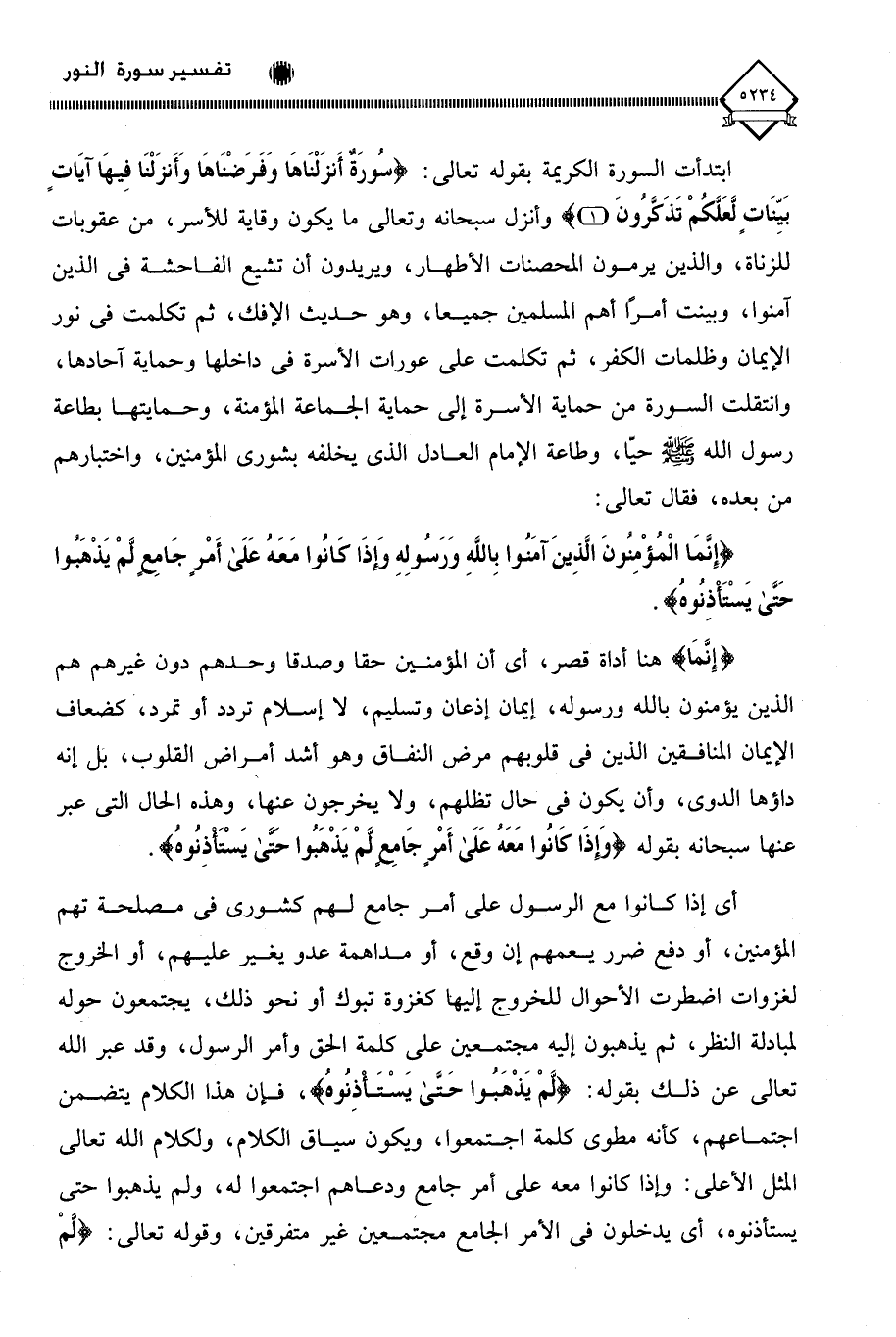 (إِنَّمَا الْمُؤْمِنُونَ الَّذِينَ آمَنُوا بِاللَّهِ وَرَسُولِهِ وَإِذَا كَانُوا مَعَهُ عَلَى أَمْرٍ جَامِعٍ لَمْ يَذْهَبُوا حَتَّى يَسْتَأْذِنُوهُ).