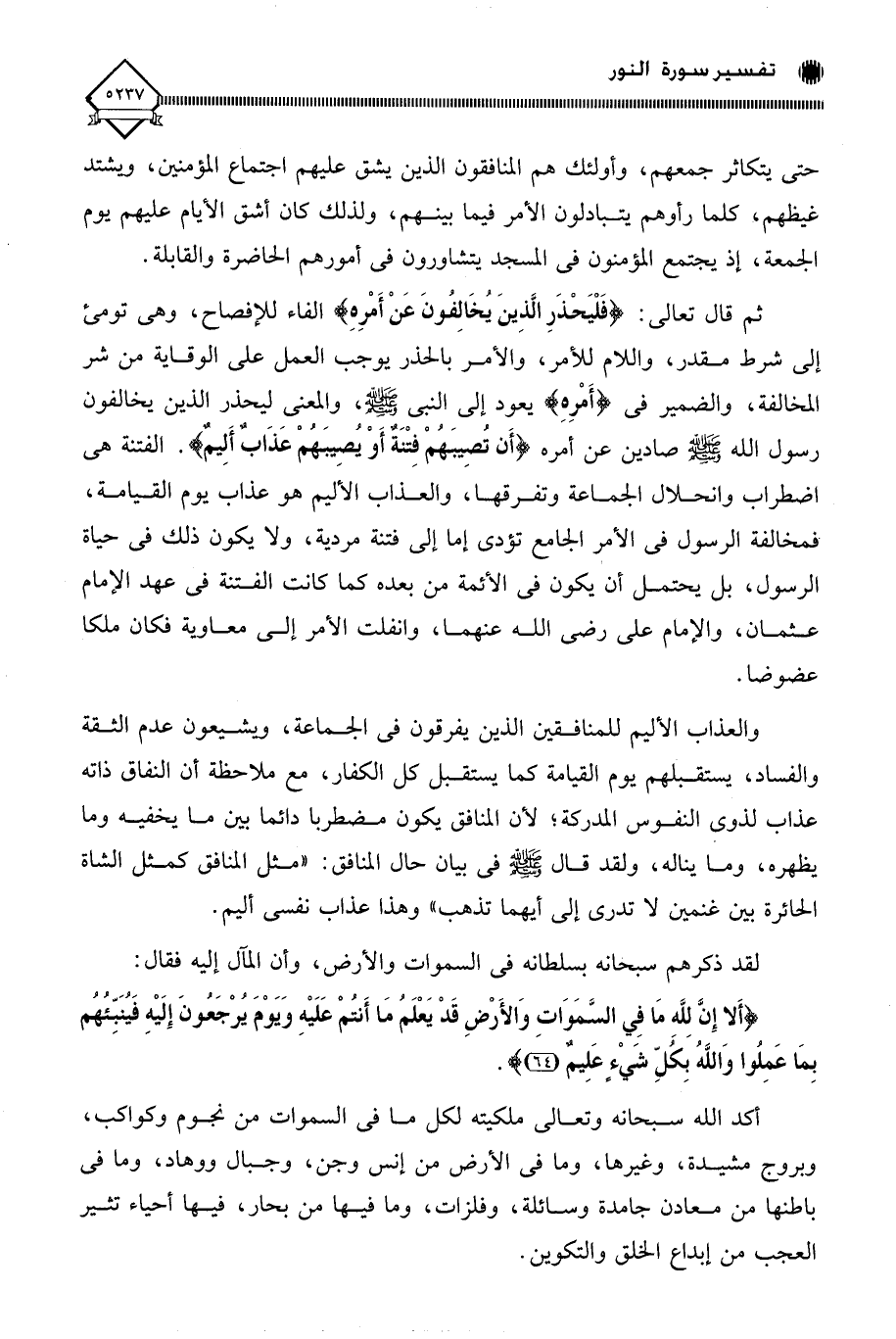 ثم قال تعالى: (فَلْيَحْذَرِ الَّذِينَ يُخَالِفُونَ عَنْ أَمْرِهِ) الفاء للإفصاح، وهي تومئ إلى شرط مقدر، واللام للأمر، والأمر بالحذر يوجب العمل على الوقاية من شر المخالفة، والضمير في (أَمْرِهِ) يعود إلى النبي - صلى الله عليه وسلم -، والمعنى ليحذر الذين يخالفون رسول الله - صلى الله عليه وسلم - صادين عن أمره (أَنْ تُصِيبَهُمْ فِتْنَةٌ أَوْ يُصِيبَهُمْ عَذَابٌ أَلِيمٌ) الفتنة هي اضطراب وانحلال الجماعة وتفرقها، والعذاب الأليم هو عذاب يوم القيامة، فمخالفة الرسول في الأمر الجامع تؤدى إما إلى فتنة مردية، ولا يكون ذلك في حياة الرسول، بل يحتمل أن يكون في الأئمة من بعده كما كانت الفتنة في عهد الإمام عثمان، والإمام على رضي الله عنهما، وانفلت الأمر إلى معاوية فكان ملكا عضوضا.