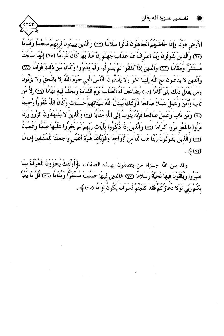 الْأَرْضِ هَوْنًا وَإِذَا خَاطَبَهُمُ الْجَاهِلُونَ قَالُوا سَلَامًا (63) وَالَّذِينَ يَبِيتُونَ لِرَبِّهِمْ سُجَّدًا وَقِيَامًا (64) وَالَّذِينَ يَقُولُونَ رَبَّنَا اصْرِفْ عَنَّا عَذَابَ جَهَنَّمَ إِنَّ عَذَابَهَا كَانَ غَرَامًا (65) إِنَّهَا سَاءَتْ مُسْتَقَرًّا وَمُقَامًا (66) وَالَّذِينَ إِذَا أَنْفَقُوا لَمْ يُسْرِفُوا وَلَمْ يَقْتُرُوا وَكَانَ بَيْنَ ذَلِكَ قَوَامًا (67) وَالَّذِينَ لَا يَدْعُونَ مَعَ اللَّهِ إِلَهًا آخَرَ وَلَا يَقْتُلُونَ النَّفْسَ الَّتِي حَرَّمَ اللَّهُ إِلَّا بِالْحَقِّ وَلَا يَزْنُونَ وَمَنْ يَفْعَلْ ذَلِكَ يَلْقَ أَثَامًا (68) يُضَاعَفْ لَهُ الْعَذَابُ يَوْمَ الْقِيَامَةِ وَيَخْلُدْ فِيهِ مُهَانًا (69) إِلَّا مَنْ تَابَ وَآمَنَ وَعَمِلَ عَمَلًا صَالِحًا فَأُولَئِكَ يُبَدِّلُ اللَّهُ سَيِّئَاتِهِمْ حَسَنَاتٍ وَكَانَ اللَّهُ غَفُورًا رَحِيمًا (70) وَمَنْ تَابَ وَعَمِلَ صَالِحًا فَإِنَّهُ يَتُوبُ إِلَى اللَّهِ مَتَابًا (71) وَالَّذِينَ لَا يَشْهَدُونَ الزُّورَ وَإِذَا مَرُّوا بِاللَّغْوِ مَرُّوا كِرَامًا (72) وَالَّذِينَ إِذَا ذُكِّرُوا بِآيَاتِ رَبِّهِمْ لَمْ يَخِرُّوا عَلَيْهَا صُمًّا وَعُمْيَانًا (73) وَالَّذِينَ يَقُولُونَ رَبَّنَا هَبْ لَنَا مِنْ أَزْوَاجِنَا وَذُرِّيَّاتِنَا قُرَّةَ أَعْيُنٍ وَاجْعَلْنَا لِلْمُتَّقِينَ إِمَامًا (74).