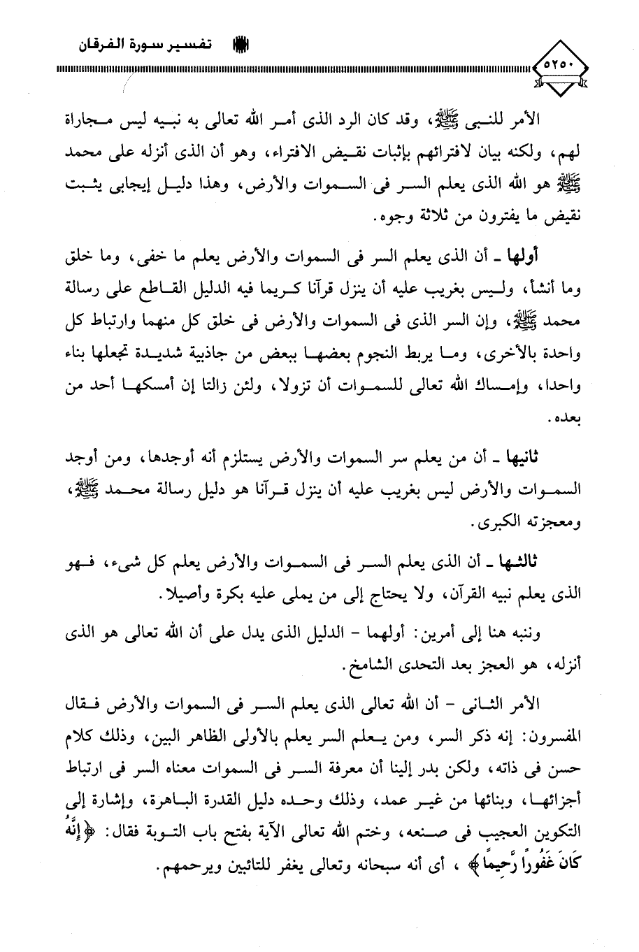 الأمر الثاني - أن اللَّه تعالى الذي يعلم السر في السماوات والأرض فقال المفسرون: إنه ذكر السر، ومن يعلم السر يعلم بالأولى الظاهر البين، وذلك كلام حسن في ذاته، ولكن بدر إلينا أن معرفة السر في السماوات معناه السر في ارتباط أجزائها، وبنائها من غير عمد، وذلك وحده دليل القدرة الباهرة، وإشارة إلى التكوين العجيب في صنعه، وختم اللَّه تعالى الآية بفتح باب التوبة فقال: (إِنَهُ كَانَ غَفُورًا رّحِيمًا)، أي أنه سبحانه وتعالى يغفر للتائبين ويرحمهم.