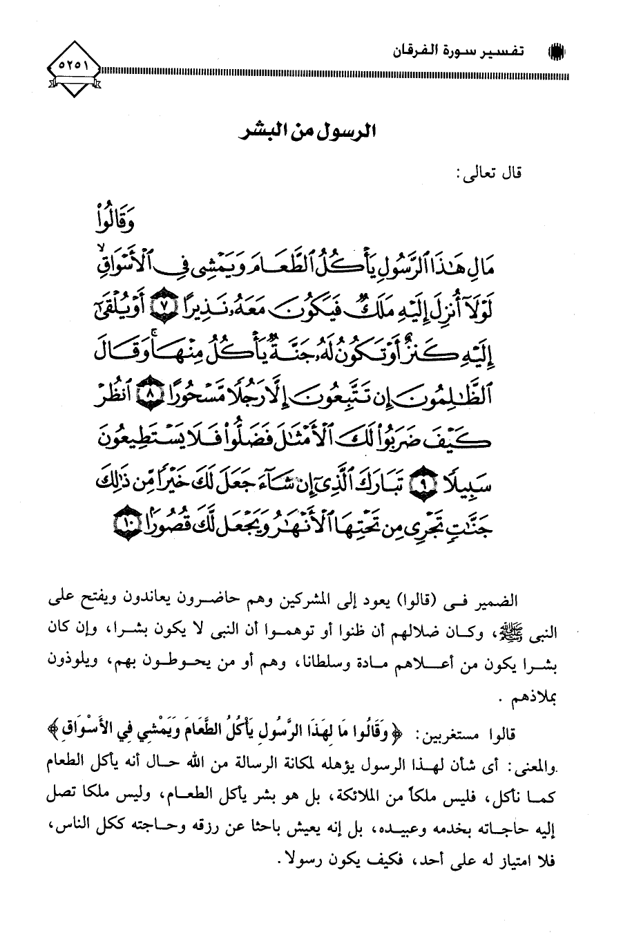 (وَقَالُوا مَالِ هَذَا الرَّسُولِ يَأْكُلُ الطَّعَامَ وَيَمْشِي فِي الْأَسْوَاقِ لَوْلَا أُنْزِلَ إِلَيْهِ مَلَكٌ فَيَكُونَ مَعَهُ نَذِيرًا (7) أَوْ يُلْقَى إِلَيْهِ كَنْزٌ أَوْ تَكُونُ لَهُ جَنَّةٌ يَأْكُلُ مِنْهَا وَقَالَ الظَّالِمُونَ إِنْ تَتَّبِعُونَ إِلَّا رَجُلًا مَسْحُورًا (8) انْظُرْ كَيْفَ ضَرَبُوا لَكَ الْأَمْثَالَ فَضَلُّوا فَلَا يَسْتَطِيعُونَ سَبِيلًا (9) تَبَارَكَ الَّذِي إِنْ شَاءَ جَعَلَ لَكَ خَيْرًا مِنْ ذَلِكَ جَنَّاتٍ تَجْرِي مِنْ تَحْتِهَا الْأَنْهَارُ وَيَجْعَلْ لَكَ قُصُورًا (10)