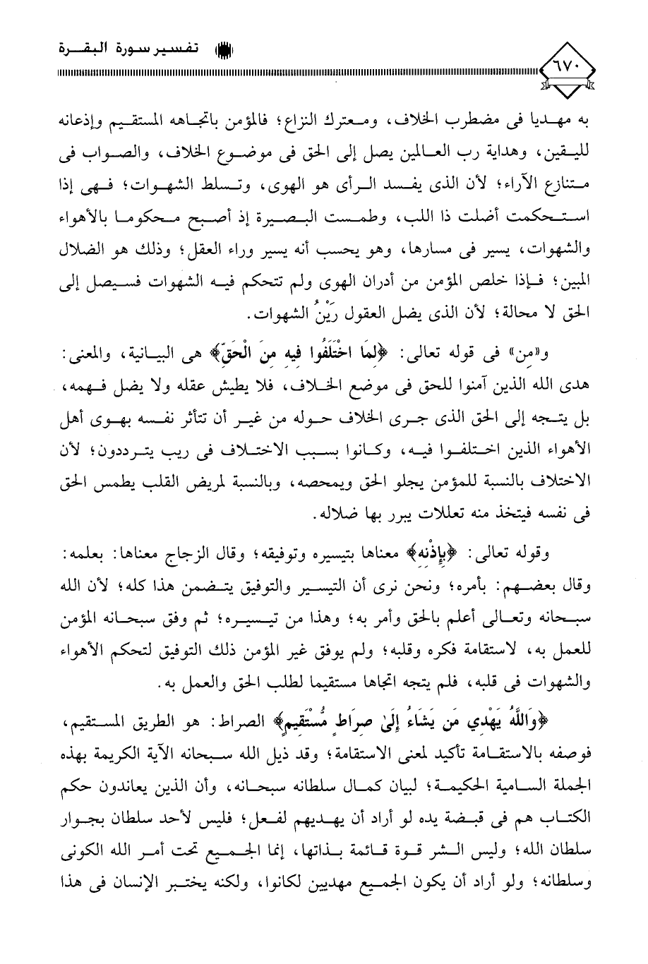 به مهديا في مضطرب الخلاف، ومعترك النزاع؛ فالمؤمن باتجاهه المستقيم وإذعانه لليقين، وهداية رب العالمين يصل إلى الحق في موضوع الخلاف، والصواب في متنازع الآراء، لأن الذي يفسد الرأي هو الهوى، وتسلط الشهوات، فهي إذا استحكمت أضلت ذا اللب، وطمست البصيرة إذ أصبح محكوما بالأهواء والشهوات، يسير في مسارها، وهو يحسب أنه يسير وراء العقل؛ وذلك هو الضلال المبين؛ فإذا خلص المؤمن من أدران الهوى ولم تتحكم فيه الشهوات فسيصل إلى الحق لَا محالة، لأن الذي يضل العقول رَيْنُ الشهوات.