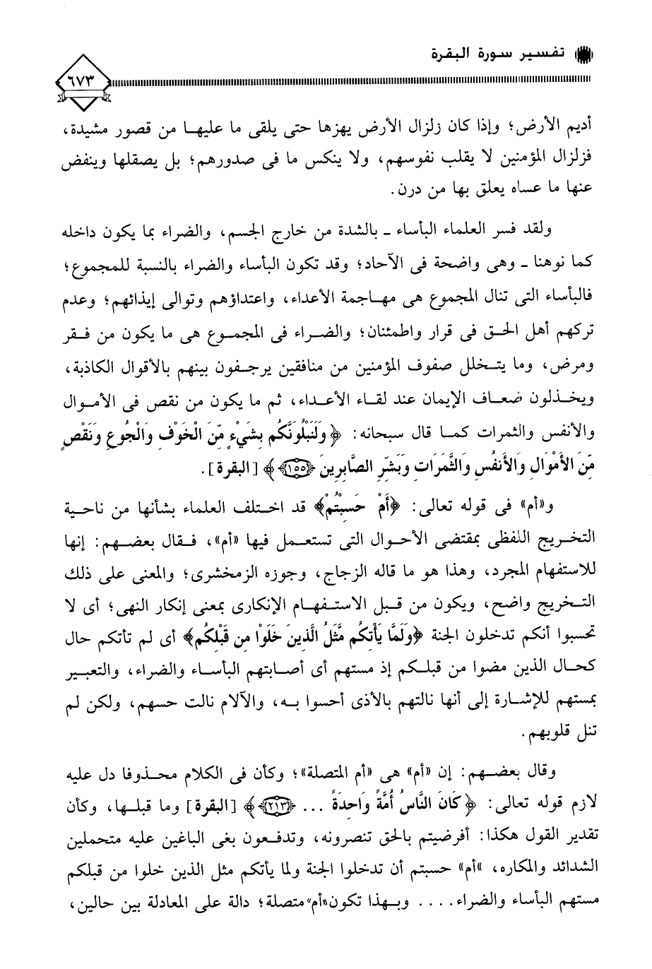 وقال بعضهم: إن " أم " هي " أم المتصلة "؛ وكان في الكلام محذوفا دل عليه لازم قوله تعالى: (كَانَ النَّاسُ أُمَّةً وَاحِدَةً. . .)، وما قبلها، وكأن تقدير القول هكذا: أفرضيتم بالحق تنصرونه، وتدفعون بغي الباغين عليه متحملين الشدائد والمكاره، " أم " حسبتم أن تدخلوا الجنة ولما يأتكم مثل الذين خلوا من قبلكم مستهم البأساء والضراء. . . . وبهذا تكون (أم) متصلة دالة على المعادلة بين حالين،