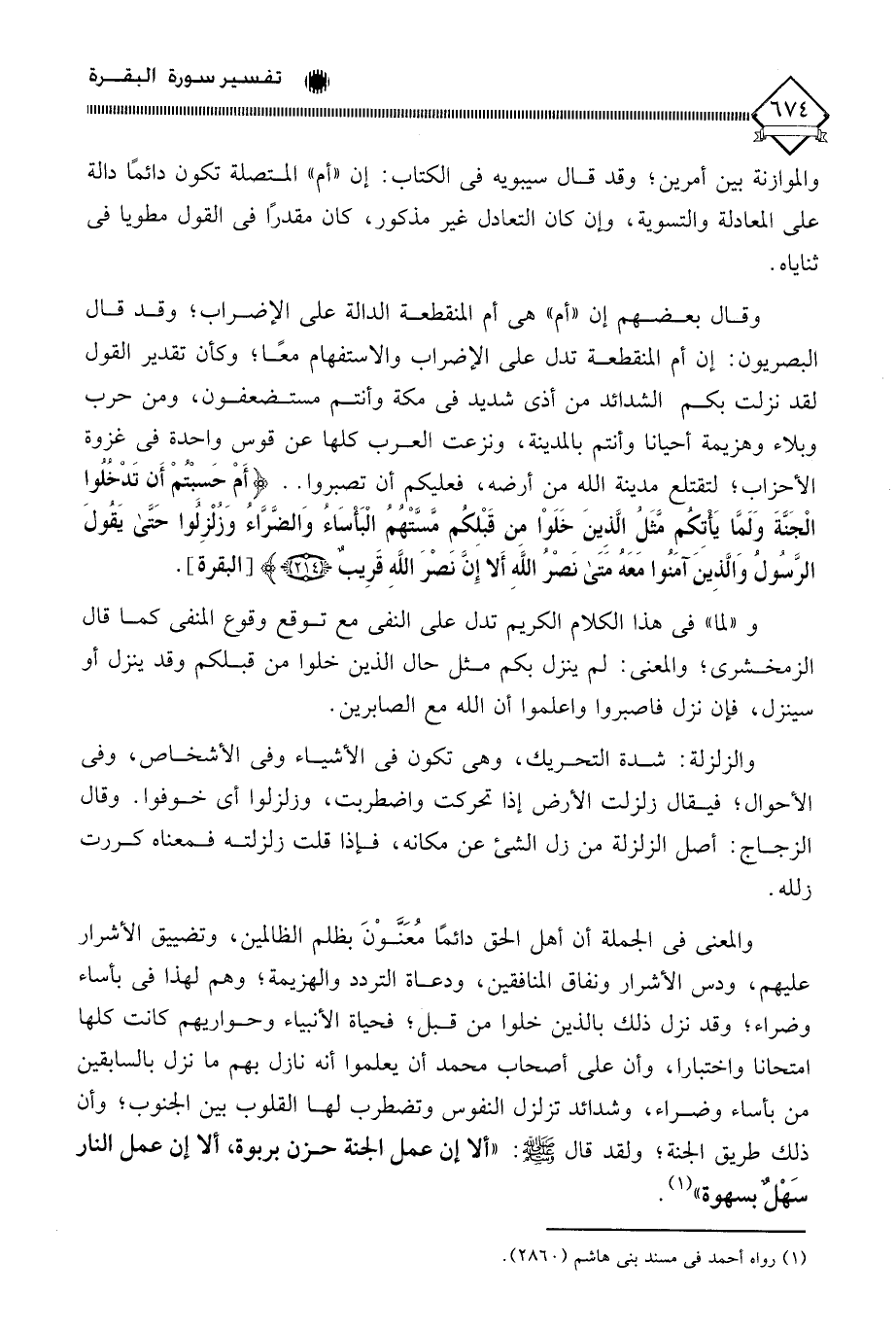 وقال بعضهم إن " أم " هي أم المنقطعة الدالة على الإضراب " وقد قال البصريون: إن أم المنقطعة تدل على الإضراب والاستفهام معًا، وكأن تقدير القول لقد نزلت بكم الشدائد من أذى شديد في مكة وأنتم مستضعفون، ومن حرب وبلاء وهزيمة أحيانا وأنتم بالمدينة، ونزعت العرب كلها عن قوس واحدة في غزوة الأحزاب، لتقتلع مدينة الله من أرضه، فعليكم أن تصبروا. . (أَمْ حَسِبْتُمْ أَنْ تَدْخُلُوا الْجَنَّةَ وَلَمَّا يَأْتِكُمْ مَثَلُ الَّذِينَ خَلَوْا مِنْ قَبْلِكُمْ مَسَّتْهُمُ الْبَأْسَاءُ وَالضَّرَّاءُ وَزُلْزِلُوا حَتَّى يَقُولَ الرَّسُولُ وَالَّذِينَ آمَنُوا مَعَهُ مَتَى نَصْرُ اللَّهِ أَلَا إِنَّ نَصْرَ اللَّهِ قَرِيبٌ (214).