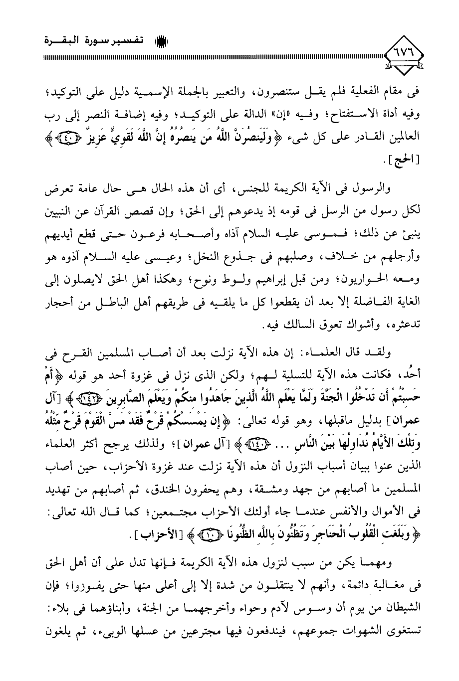 ومهما يكن من سبب لنزول هذه الآية الكريمة فإنها تدل على أن أهل الحق في مغالبة دائمة، وأنهم لَا ينتقلون من شدة إلا إلى أعلى منها حتى يفوزوا؛ فإن الشيطان من يوم أن وسوس لآدم وحواء وأخرجهما من الجنة، وأبناؤهما في بلاء: تستغوي الشهوات جموعهم، فيندفعون فيها مجترعين من عسلها الوبئ، ثم يلغون