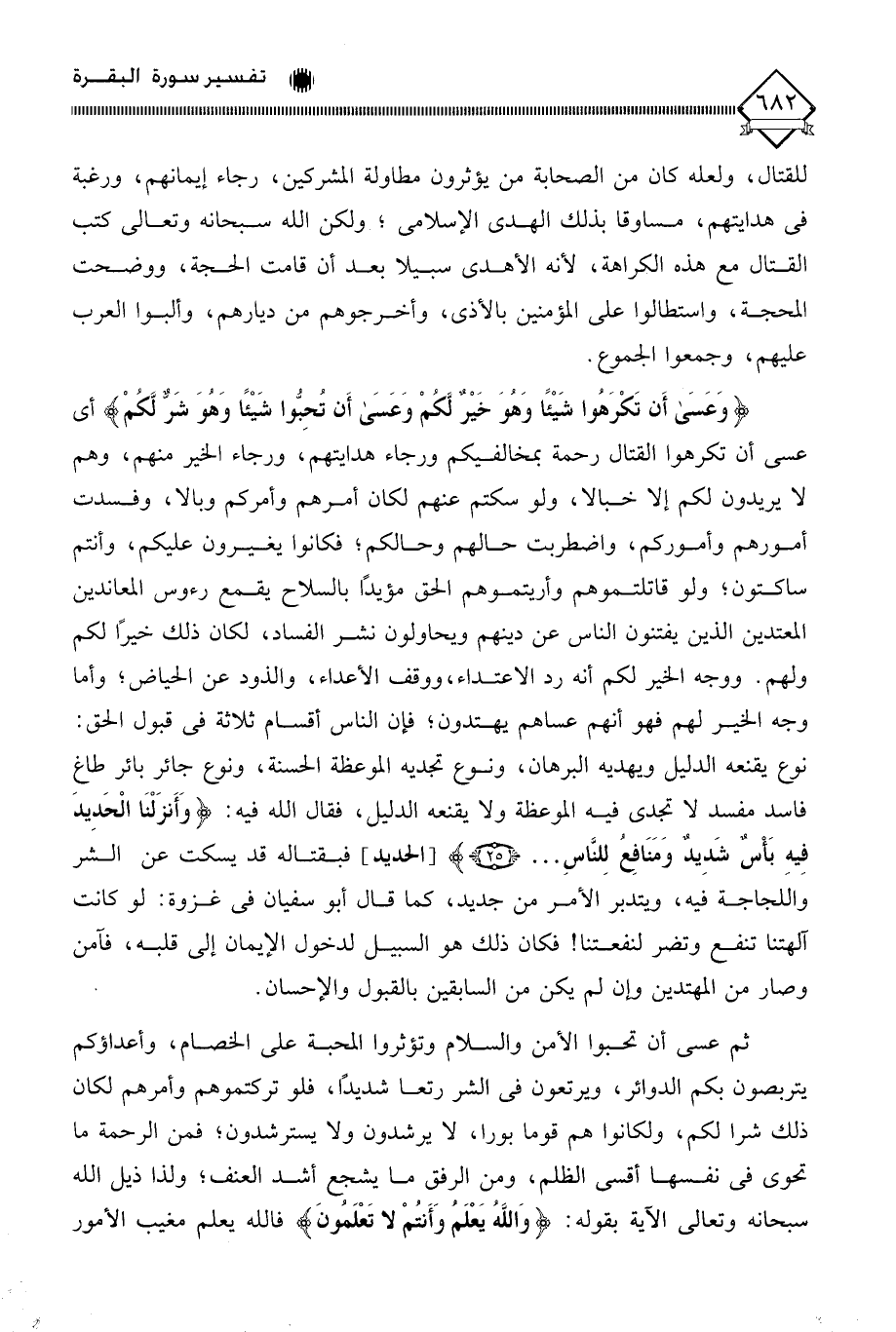 (وَعَسَى أَن تَكْرَهُوا شَيْئًا وَهُوَ خَيْرٌ لكُمْ وَعَسَى أَن تُحِبُّوا شَيْئًا وَهُوَ شَرٌّ لكُمْ) أي عسى أن تكرهوا القتال رحمة بمخالفيكم ورجاء هدايتهم، ورجاء الخير منهم، وهم لا يريدون لكم إلا خبالا، ولو سكتم عنهم لكان أمرهم وأمركم وبالا، وفسدت أمورهم وأموركم، واضطربت حالهم وحالكم، فكانوا يغيرون عليكم، وأنتم ساكتون؛ ولو قاتلتموهم وأريتموهم الحق مؤيدًا بالسلاح يقمع رءوس المعاندين المعتدين الذين يفتنون الناس عن دينهم ويحاولون نشر الفساد، لكان ذلك خيرًا لكم ولهم. ووجه الخير لكم أنه رد الاعتداء، ووقف الأعداء، والذود عن الحياض؛ وأما وجه الخير لهم فهو أنهم عساهم يهتدون؛ فإن الناس أقسام ثلاثة في قبول الحق: نوع يقنعه الدليل ويهديه البرهان، ونوع تجديه الموعظة الحسنة، ونوع جائر بائر طاغ فاسد مفسد لَا تجدي فيه الموعظة ولا يقنعه الدليل، فقال الله فيه: (وَأَنزَلْنَا الْحَدِيدَ فِيهِ بَأسٌ شَدِيدٌ وَمَنَافِعُ لِلنَّاسِ. . .)، فبقتاله قد يسكت عن الشر واللجاجة فيه، ويتدبر الأمر من جديد، كما قال أبو سفيان في غزوة: لو كانت آلهتنا تنفع وتضر لنفعتنا! فكان ذلك هو السبيل لدخول الإيمان إلى قلبه، فآمن وصار من المهتدين وإن لم يكن من السابقين بالقبول والإحسان.