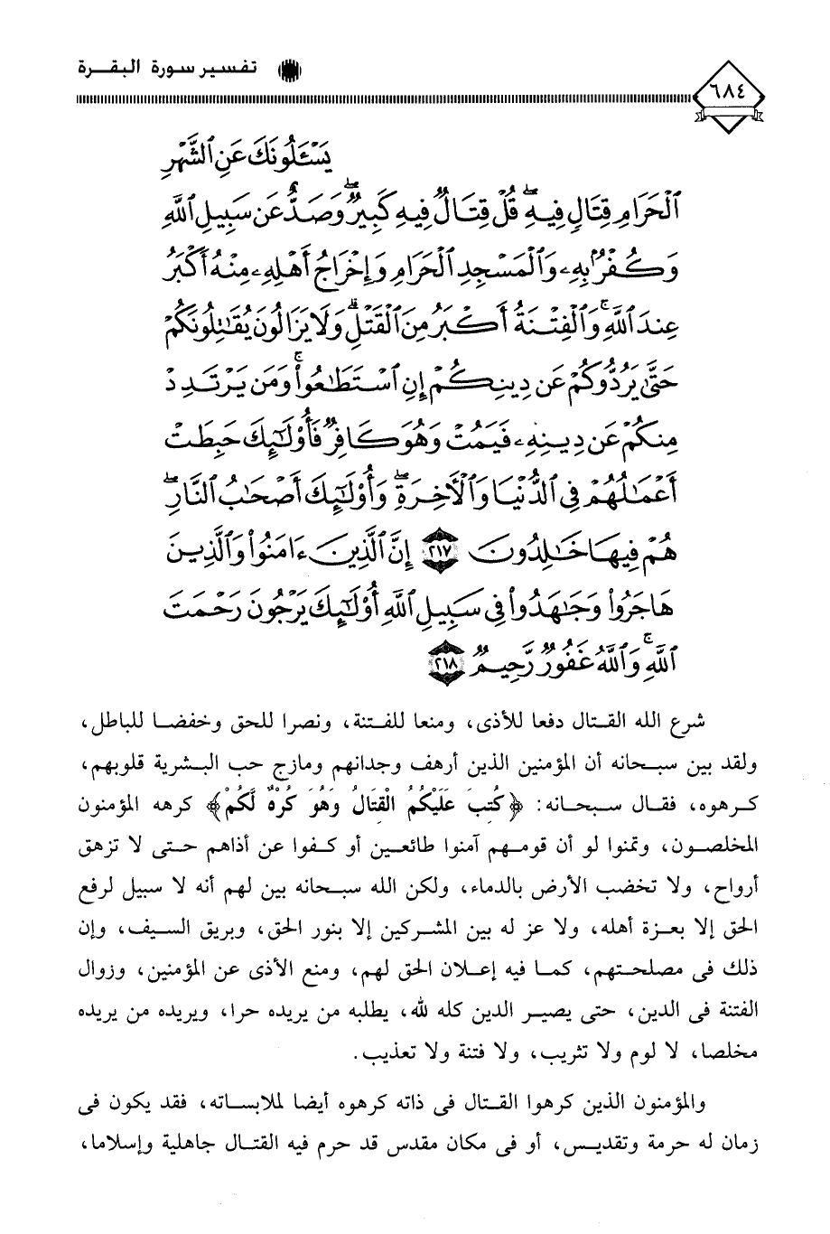 (يَسْأَلُونَكَ عَنِ الشَّهْرِ الْحَرَامِ قِتَالٍ فِيهِ قُلْ قِتَالٌ فِيهِ كَبِيرٌ وَصَدٌّ عَنْ سَبِيلِ اللَّهِ وَكُفْرٌ بِهِ وَالْمَسْجِدِ الْحَرَامِ وَإِخْرَاجُ أَهْلِهِ مِنْهُ أَكْبَرُ عِنْدَ اللَّهِ وَالْفِتْنَةُ أَكْبَرُ مِنَ الْقَتْلِ وَلَا يَزَالُونَ يُقَاتِلُونَكُمْ حَتَّى يَرُدُّوكُمْ عَنْ دِينِكُمْ إِنِ اسْتَطَاعُوا وَمَنْ يَرْتَدِدْ مِنْكُمْ عَنْ دِينِهِ فَيَمُتْ وَهُوَ كَافِرٌ فَأُولَئِكَ حَبِطَتْ أَعْمَالُهُمْ فِي الدُّنْيَا وَالْآخِرَةِ وَأُولَئِكَ أَصْحَابُ النَّارِ هُمْ فِيهَا خَالِدُونَ (217) إِنَّ الَّذِينَ آمَنُوا وَالَّذِينَ هَاجَرُوا وَجَاهَدُوا فِي سَبِيلِ اللَّهِ أُولَئِكَ يَرْجُونَ رَحْمَتَ اللَّهِ وَاللَّهُ غَفُورٌ رَحِيمٌ (218)