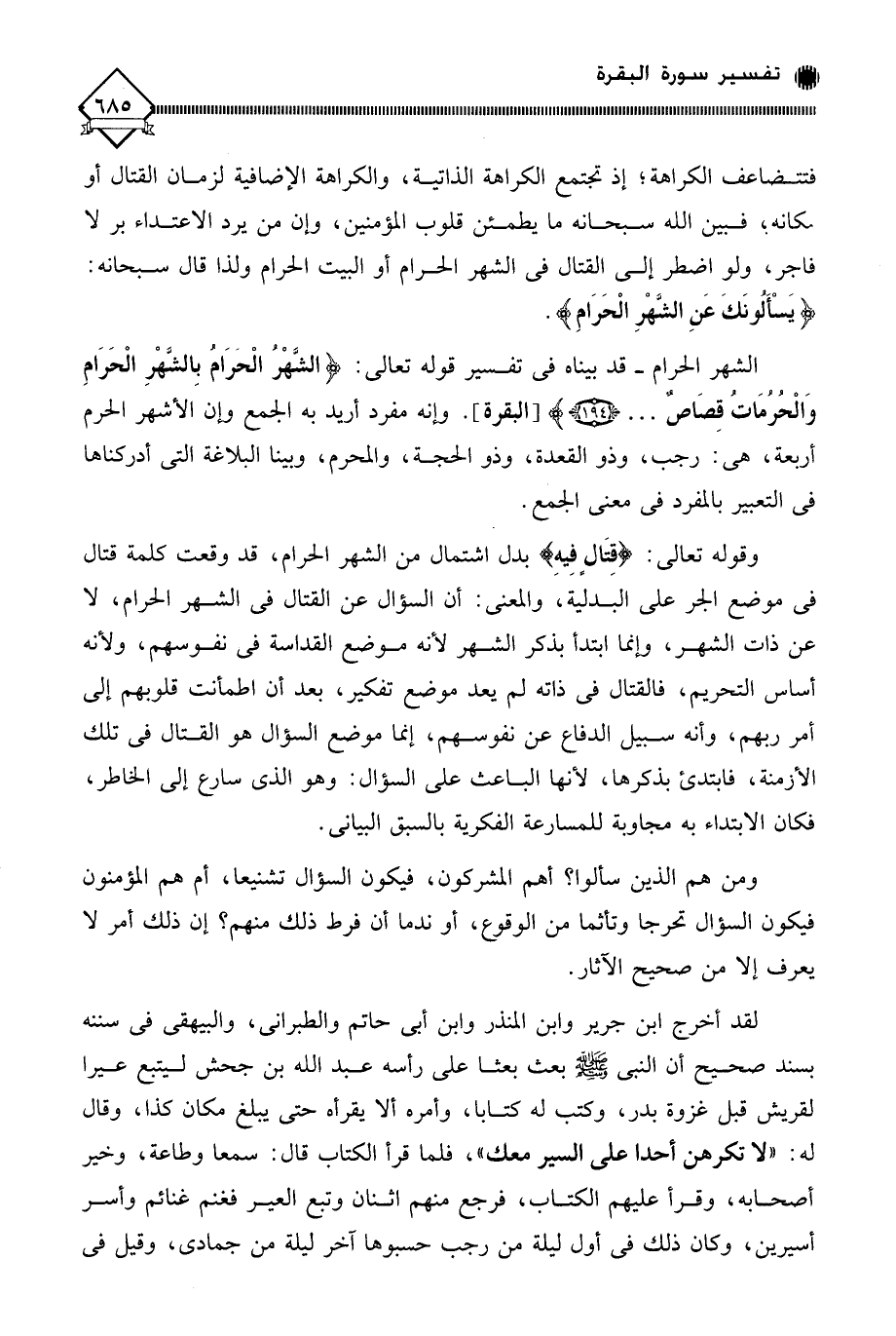 الشهر الحرام - قد بيناه في تفسير قوله تعالى: (الشَّهْرُ الْحَرَامُ بِالشهْرِ الْحَرَامِ وَالْحُرُمَاتُ قِصَاص. . .). وإنه مفرد أريد به الجمع وإن الأشهر الحرم أربعة، هي: رجب، وذو القعدة، وذو الحجة، والمحرم، وبينا البلاغة التي أدركناها في التعبير بالمفرد في معنى الجمع.