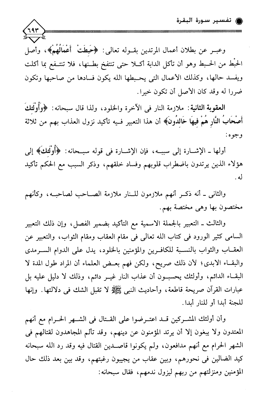 والثالث - التعبير بالجملة الاسمية مع التأكيد بضمير الفصل، وإن ذلك التعبير السامي كثير الورود في كتاب الله تعالى في مقام العقاب ومقام الثواب، والتعبير عن العقاب والثواب بالنسبة للكافرين والمؤمنين بالخلود، يدل على الدوام السرمدي والبقاء الأبدي، لأن ذلك صريح، ولكن فهم بعض العلماء أن المراد طول المدة لا البقاء الدائم، وأولئك يحسبون أن عذاب النار غير دائم، وذلك لَا دليل عليه بل عبارات القرآن صريحة قاطعة، وأحاديث النبي - صلى الله عليه وسلم - لَا تقبل الشك في دلالتها. وإنها للجنة أبدا أو للنار أبدا.