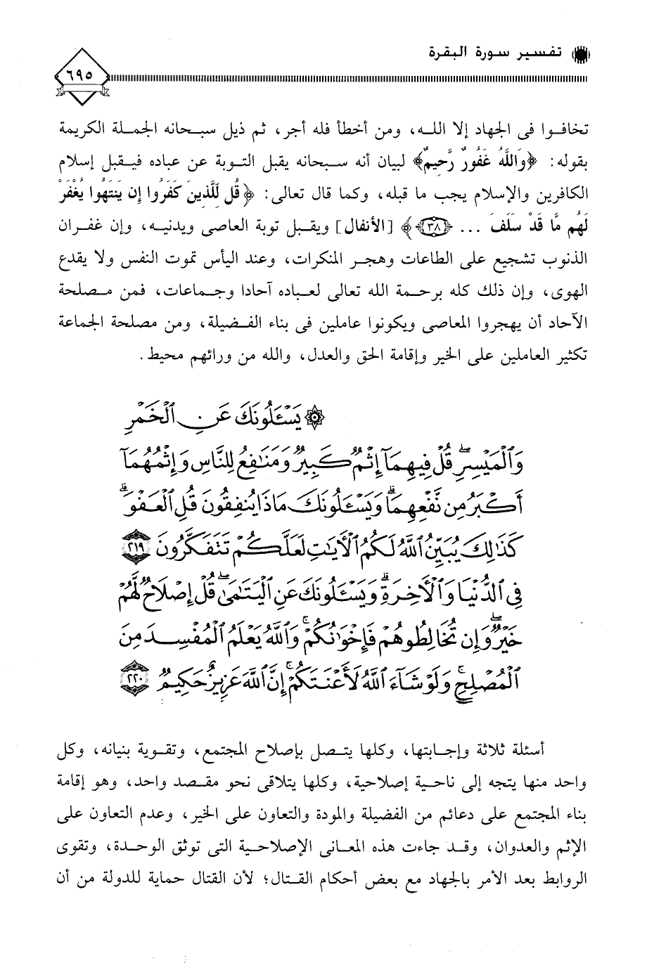 أسئلة ثلاثة وإجابتها، وكلها يتصل بإصلاح المجتمع، وتقوية بنيانه، وكل واحد منها يتجه إلى ناحية إصلاحية، وكلها يتلاقى نحو مقصد واحد، وهو إقامة بناء المجتمع على دعائم من الفضيلة والمودة والتعاون على الخير، وعدم التعاون على الإثم والعدوان، وقد جاءت هذه المعاني الإصلاحية التي توثق الوحدة، وتقوى الروابط بعد الأمر بالجهاد مع بعض أحكام القتال؛ لأن القتال حماية للدولة من أن