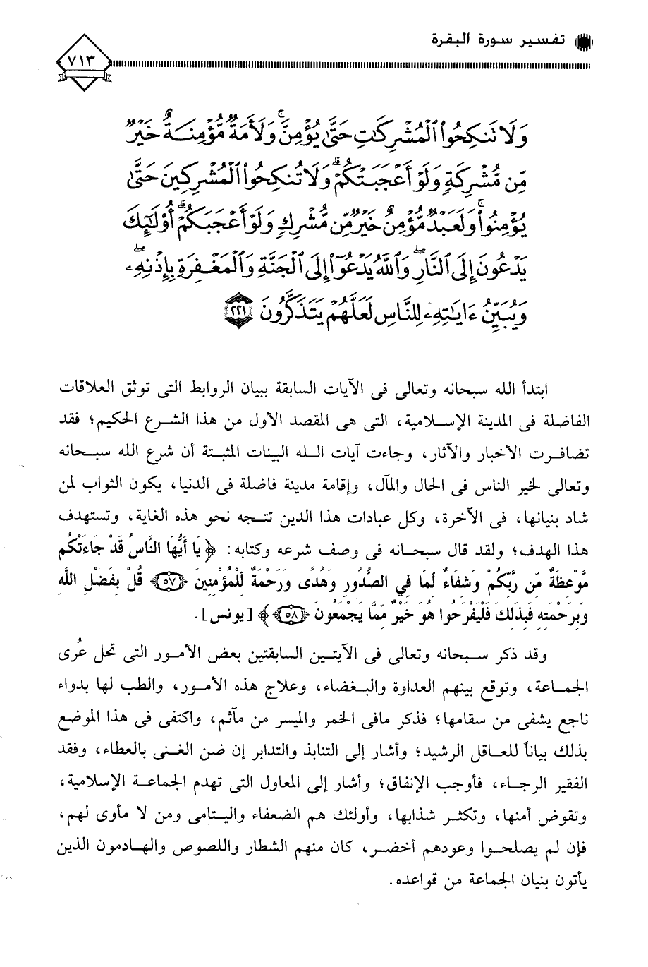 (وَلَا تَنْكِحُوا الْمُشْرِكَاتِ حَتَّى يُؤْمِنَّ وَلَأَمَةٌ مُؤْمِنَةٌ خَيْرٌ مِنْ مُشْرِكَةٍ وَلَوْ أَعْجَبَتْكُمْ وَلَا تُنْكِحُوا الْمُشْرِكِينَ حَتَّى يُؤْمِنُوا وَلَعَبْدٌ مُؤْمِنٌ خَيْرٌ مِنْ مُشْرِكٍ وَلَوْ أَعْجَبَكُمْ أُولَئِكَ يَدْعُونَ إِلَى النَّارِ وَاللَّهُ يَدْعُو إِلَى الْجَنَّةِ وَالْمَغْفِرَةِ بِإِذْنِهِ وَيُبَيِّنُ آيَاتِهِ لِلنَّاسِ لَعَلَّهُمْ يَتَذَكَّرُونَ (221)