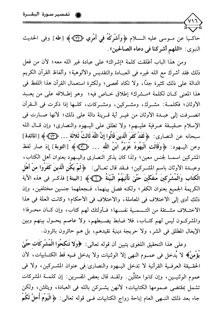 وعلى هذا التحقيق اللغوي يتبين أن قوله تعالى: (وَلا تَنكِحُوا الْمُشْرِكَاتِ حَتًى يُؤْمِنَّ) لَا يُدخل في عموم النهي إلا الوثنيات ولا يدخل فيه قط الكتابيات، لأن الحقيقة العرفية القرآنية لَا تدخل اليهود والنصارى في عنوان المشركين، ولا في عموم الوثنيين، وإن كانوا مثلثين. ولقد قال بعض المفسرين: إن كلمة المشركات تشمل بمقتضى عمومها الكتابيات؛ لأنهن يشركن بالله في العبادة، ويثلثن، ولكن جاء بعد ذلك النهي العام إباحة زواج الكتابيات في قوله تعالى: (الْيَوْمَ أُحِلَّ لَكُمُ