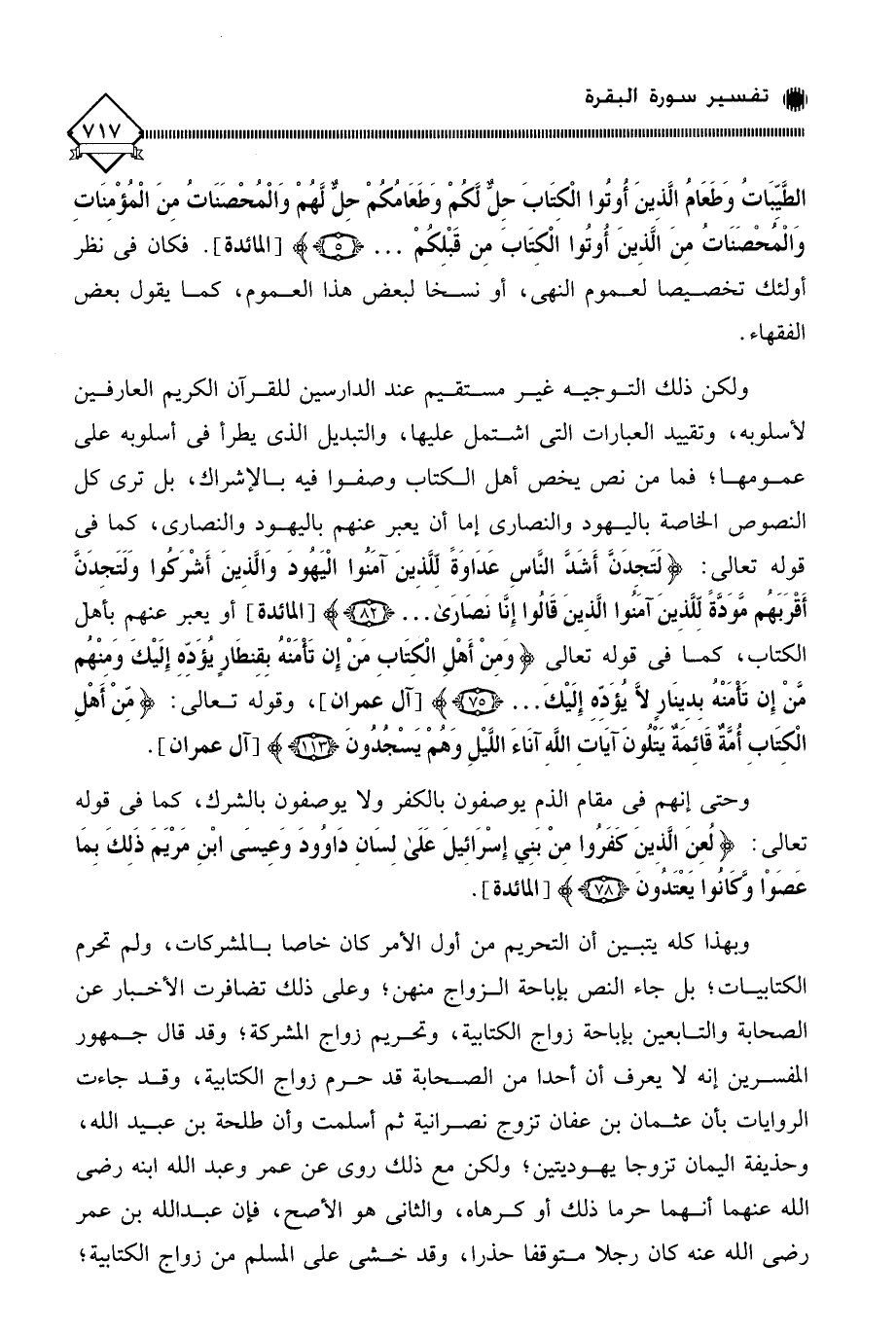وبهذا كله يتبين أن التحريم من أول الأمر كان خاصا بالمشركات، ولم تحرم الكتابيات؛ بل جاء النص بإباحة الزواج منهن؛ وعلى ذلك تضافرت الأخبار عن الصحابة والتابعين بإباحة زواج الكتابية، وتحريم زواج المشركة؛ وقد قال جمهور المفسرين إنه لَا يعرف أن أحدا من الصحابة قد حرم زواج الكتابية، وقد جاءت الروايات بأن عثمان بن عفان تزوج نصرانية ثم أسلمت وأن طلحة بن عبيد الله، وحذيفة بن اليمان تزوجا يهوديتين؛ ولكن مع ذلك روي عن عمر وعبد الله ابنه رضي الله عنهما أنهما حرما ذلك أو كرهاه، والثاني هو الأصح، فإن عبد الله بن عمر رضي الله عنه كان رجلا متوقفا حذرا، وقد خشي على المسلم من زواج الكتابية؛