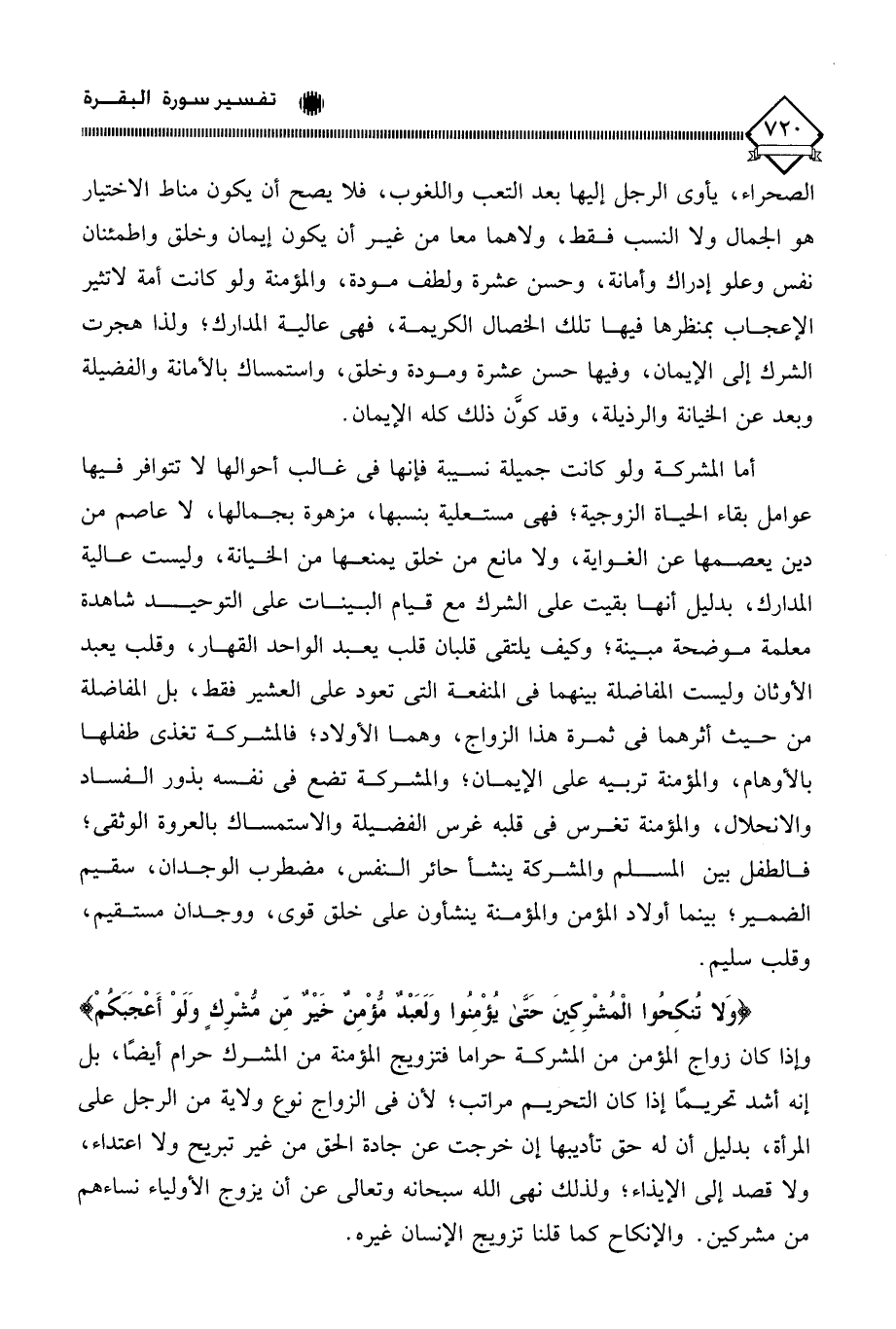أما المشركة ولو كانت جميلة نسيبة فإنها في غالب أحوالها لَا تتوافر فيها عوامل بقاء الحياة الزوجية، فهي مستعلية بنسبها، مزهوة بجمالها، لَا عاصم من دين يعصمها عن الغواية، ولا مانع من خلق يمنعها من الخيانة، وليست عالية المدارك، بدليل أنها بقيت على الشرك مع قيام البينات على التوحيد شاهدة معلمة موضحة مبينة، وكيف يلتقي قلبان قلب يعبد الواحد القهار، وقلب يعبد الأوثان وليست المفاضلة بينهما في المنفعة التي تعود على العشير فقط، بل المفاضلة من حيث أثرهما في ثمرة هذا الزواج، وهما الأولاد، فالمشركة تغذي طفلها بالأوهام، والمؤمنة تربيه على الإيمان، والمشركة تضع في نفسه بذور الفساد والانحلال، والمؤمنة تغرس في قلبه غرس الفضيلة والاستمساك بالعروة الوثقى، فالطفل بين المسلم والمشركة ينشأ حائر النفس، مضطرب الوجدان، سقيم الضمير؛ بينما أولاد المؤمن والمؤمنة ينشأون على خلق قوي، ووجدان مستقيم، وقلب سليم.