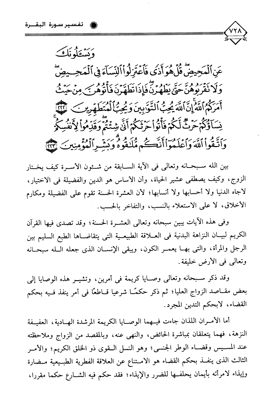 (وَيَسْأَلُونَكَ عَنِ الْمَحِيضِ قُلْ هُوَ أَذًى فَاعْتَزِلُوا النِّسَاءَ فِي الْمَحِيضِ وَلَا تَقْرَبُوهُنَّ حَتَّى يَطْهُرْنَ فَإِذَا تَطَهَّرْنَ فَأْتُوهُنَّ مِنْ حَيْثُ أَمَرَكُمُ اللَّهُ إِنَّ اللَّهَ يُحِبُّ التَّوَّابِينَ وَيُحِبُّ الْمُتَطَهِّرِينَ (222) نِسَاؤُكُمْ حَرْثٌ لَكُمْ فَأْتُوا حَرْثَكُمْ أَنَّى شِئْتُمْ وَقَدِّمُوا لِأَنْفُسِكُمْ وَاتَّقُوا اللَّهَ وَاعْلَمُوا أَنَّكُمْ مُلَاقُوهُ وَبَشِّرِ الْمُؤْمِنِينَ (223)
