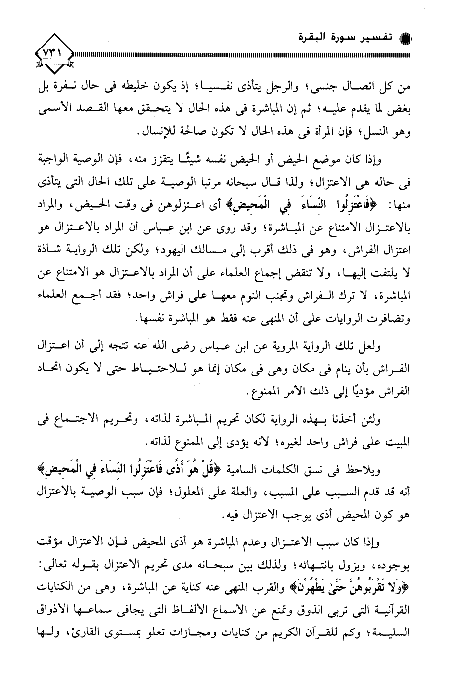 من كل اتصال جنسي؛ والرجل يتأذي نفسيا؛ إذ يكون خليطه في حال نفرة بل بغض لما يقدم عليه؛ ثم إن المباشرة في هذه الحال لَا يتحقق معها القصد الأسمى وهو النسل؛ فإن المرأة في هذه الحال لَا تكون صالحة للإنسال.