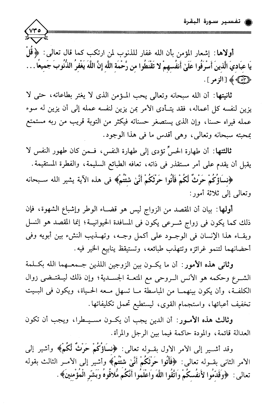 وقد أشير إلى الأمر الأول بقوله تعالى: (نسَاؤكمْ حَرْثٌ لكُمْ) وأشير إلى الأمر الثاني بقوله تعالى: (فَأتُوا حَرْثَكُمْ أَنَّى شئْتُمْ) وأشير إلى الأمر الثالث بقوله تعالى: (وَقَدِّمُوا لأَنفُسِكُمْ وَاتَّقُوا اللَّهَ وَاعْلَمُوا أَنَّكُمَ مُّلاقُوهُ وَبَشِّرِ الْمُؤْمِنِينَ).