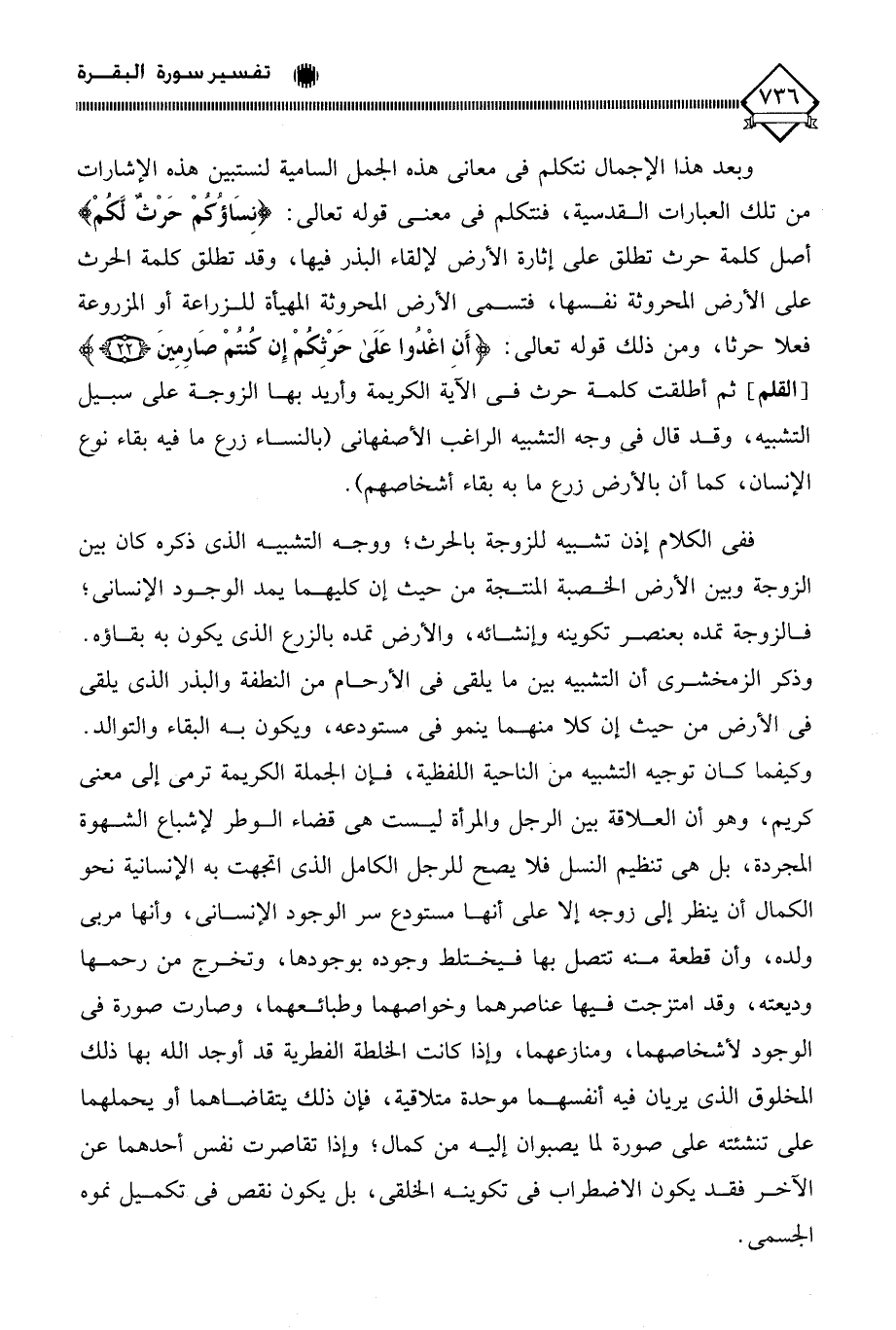 وكيفما كان توجيه التشبيه من الناحية اللفظية، فإن الجملة الكريمة ترمي إلى معنى كريم، وهو أن العلاقة بين الرجل والمرأة ليست هي قضاء الوطر لإشباع الشهوة المجردة، بل هي تنظيم النسل فلا يصح للرجل الكامل الذي اتجهت به الإنسانية نحو الكمال أن ينظر إلى زوجه إلا على أنها مستودع سر الوجود الإنساني، وأنها مربى ولده، وأن قطعة منه تتصل بها فيختلط وجوده بوجودها، وتخرج من رحمها وديعته، وقد امتزجت فيها عناصرهما وخواصهما وطبائعهما، وصارت صورة في الوجود لأشخاصهما، ومنازعهما، وإذا كانت الخلطة الفطرية قد أوجد الله بها ذلك المخلوق الذي يريان فيه أنفسهما موحدة متلاقية، فإن ذلك يتقاضاهما أو يحملهما على تنشئته على صورة لَا يصبوان إليه من كمال؛ وإذا تقاصرت نفس أحدهما عن الآخر فقد يكون الاضطراب في تكوينه الخلقي، بل يكون نقص في تكميل نموه الجسمي.