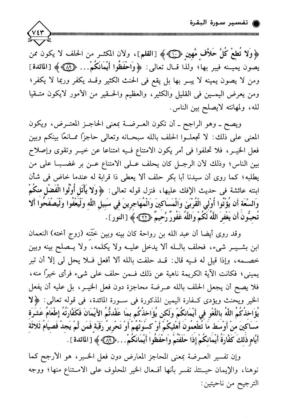 (لَا يُؤَاخِذُكُمُ اللَّهُ بِاللَّغْوِ فِي أَيْمَانِكُمْ وَلَكِنْ يُؤَاخِذُكُمْ بِمَا عَقَّدْتُمُ الْأَيْمَانَ فَكَفَّارَتُهُ إِطْعَامُ عَشَرَةِ مَسَاكِينَ مِنْ أَوْسَطِ مَا تُطْعِمُونَ أَهْلِيكُمْ أَوْ كِسْوَتُهُمْ أَوْ تَحْرِيرُ رَقَبَةٍ فَمَنْ لَمْ يَجِدْ فَصِيَامُ ثَلَاثَةِ أَيَّامٍ ذَلِكَ كَفَّارَةُ أَيْمَانِكُمْ إِذَا حَلَفْتُمْ وَاحْفَظُوا أَيْمَانَكُمْ. . .). وإن تفسير العرضة بمعنى المحاجز المعارض دون فعل الخير، هو الأرجح كما نوهنا، والإيمان حينئذ تفسر بأنها أفعال الخير المحلوف على الامتناع منها؛ ووجه الترجيح من ناحيتين: