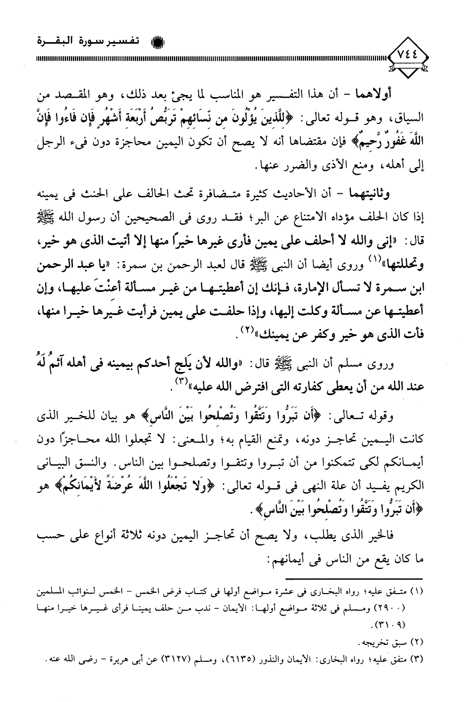 وثانيتهما - أن الأحاديث كثيرة متضافرة تحث الحالف على الحنث في يمينه إذا كان الحلف مؤداه الامتناع عن البر؛ فقد روي في الصحيحين أن رسول الله - صلى الله عليه وسلم - قال: " إني والله لَا أحلف على يمين فأرى غيرها خيرًا منها إلا أتيت الذي هو خير، وتحللتها " (¬1) وروى أيضا أن النبي - صلى الله عليه وسلم - قال لعبد الرحمن بن سمرة: " يا عبد الرحمن ابن سمرة لَا تسأل الإمارة، فإنك إن أعطيتها من غير مسألة أعِنْتَ عليها، وإن أعطيتها عن مسألة وكلت إليها، وإذا حلفت على يمين فرأيت غيرها خيرا منها، فأت الذي هو خير وكفر عن يمينك " (¬2).