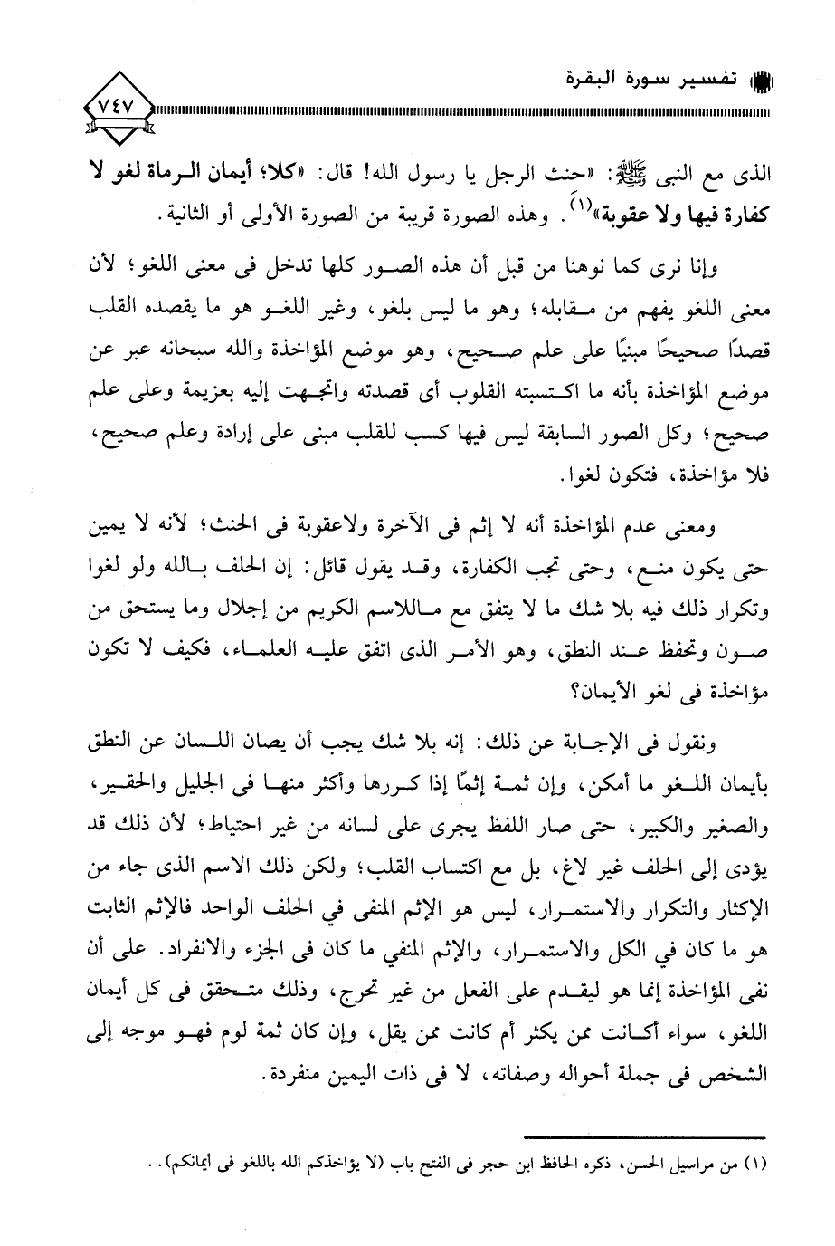 وإنا نرى كما نوهنا من قبل أن هذه الصور كلها تدخل في معنى اللغو؛ لأن معنى اللغو يفهم من مقابله؛ وهو ما ليس بلغو، وغير اللغو هو ما يقصده القلب قصدًا صحيحًا مبنيًا على علم صحيح، وهو موضع المؤاخذة والله سبحانه عبر عن موضع المؤاخذة بأنه ما اكتسبته القلوب أي قصدته واتجهت إليه بعزيمة وعلى علم صحيح؛ وكل الصور السابقة ليس فيها كسب للقلب مبني على إرادة وعلم صحيح، فلا مؤاخذة، فتكون لغوا.