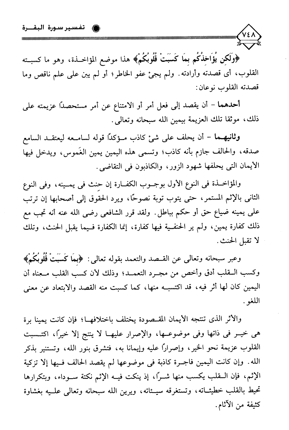 وعبر سبحانه وتعالى عن القصد والتعمد بقوله تعالى: (بِمَا كَسَبَتْ قُلُوبُكُمْ) وكسب القلب أدق وأخص من مجرد التعمد؛ وذلك لأن كسب القلب معناه أن اليمين كان لها أثر فيه، قد اكتسبه منها، كما كسبت منه القصد والابتعاد عن معنى اللغو. والأثر الذي تنتجه الأيمان المقصودة يختلف باختلافها؛ فإن كانت يمينا برة هي خير في ذاتها وفي موضوعها، والإصرار عليها لَا ينتج إلا خيرًا، اكتسبت القلوب عزيمة نحو الخير، وإصرارًا عليه وإيمانا به، فتشرق بنور الله، وتستنير بذكر الله. وإن كانت اليمين فاجرة كاذبة في موضوعها لم يقصد الحالف فيها إلا تزكية الإثم، فإن القلب يكسب منها شرًا، إذ ينكت فيه الإثم نكتة سوداء، وبتكرارها تحيط بالقلب خطيئاته، وتستغرقه سيئاته، ويرين الله سبحانه وتعالى عليه بغشاوة كثيفة من الآثام.