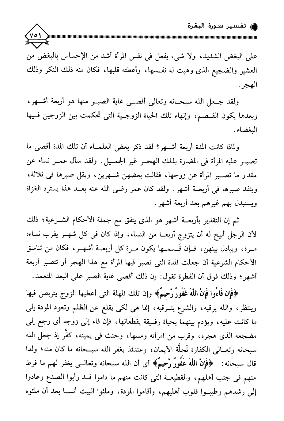 (فَإِن فَاءُوا فَإِنَّ اللَّهَ غَفُورٌ رحِيمٌ) وإن تلك المهلة التي أعطيها الزوج يتربص فيها وينتظر، والله يرقبه، والشرع يترقبه، إنما هي لكي يقلع عن الظلم وتعود المودة إلى ما كانت عليه، ويؤدم بينهما بحياة رفيقة يقطعانها، فإن فاء إلى زوجه أي رجع إلى مضجعه الذي هجره، وقرب من امرأته ومسها، وحنث في يمينه، كفَّر إذ جعل الله سبحانه وتعالى الكفارة تَحلَّة الأيمان، وعندئذ يغفر الله سبحانه ما كان منه؛ ولذا قال سبحانه: (فَإِنَّ اللَّهَ غَفورٌ رحِيمٌ) أى أن الله سبحانه وتعالى يغفر لهم ما فرط منهم في جنب أهلهم، والقطيعة التي كانت منهم ما داموا قد رأبوا الصدع وعادوا إلى رشدهم وطيبوا قلوب أهليهم، وأقاموا المودة، وملئوا البيت أنسا بعد أن ملئوه