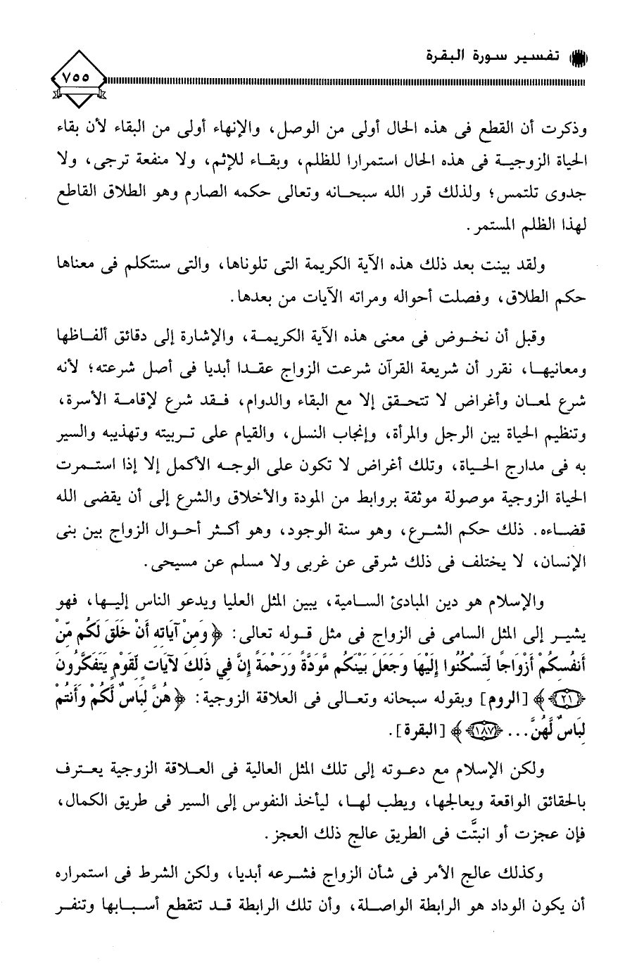 وقبل أن نخوض في معنى هذه الآية الكريمة، والإشارة إلى دقائق ألفاظها ومعانيها، نقرر أن شريعة القرآن شرعت الزواج عقدا أبديا في أصل شرعته؛ لأنه شرع لمعان وأغراض لَا تتحقق إلا مع البقاء والدوام، فقد شرع لإقامة الأسرة، وتنظيم الحياة بين الرجل والمرأة، وإنجاب النسل، والقيام على تربيته وتهذيبه والسير به في مدارج الحياة، وتلك أغراض لَا تكون على الوجه الأكمل إلا إذا استمرت الحياة الزوجية موصولة موثقة بروابط من المودة والأخلاق والشرع إلى أن يقضي الله قضاءه. ذلك حكم الشرع، وهو سنة الوجود، وهو أكثر أحوال الزواج بين بني الإنسان، لَا يختلف في ذلك شرقي عن غربي ولا مسلم عن مسيحي.