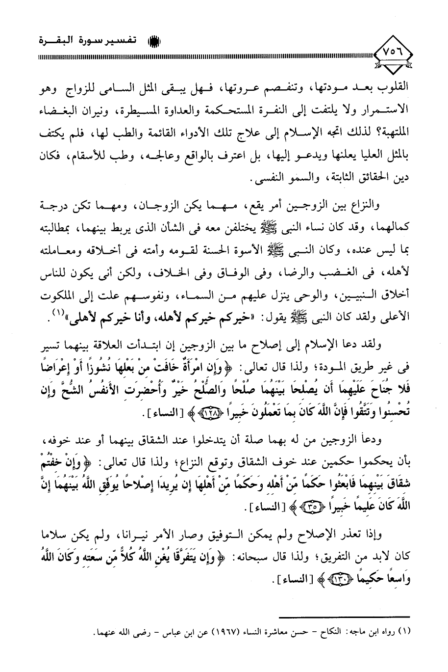 القلوْب بعد مودتها، وتنفصم عروتها، فهل يبقى المثل السامي للزواج وهو الاستمرار ولا يلتفت إلى النفرة المستحكمة والعداوة المسيطرة، ونيران البغضاء الملتهبة؛ لذلك اتجه الإسلام إلى علاج تلك الأدواء القائمة والطب لها، فلم يكتف بالمثل العليا يعلنها ويدعو إليها، بل اعترف بالواقع وعالجه، وطب للأسقام، فكان دين الحقائق الثابتة، والسمو النفسي.