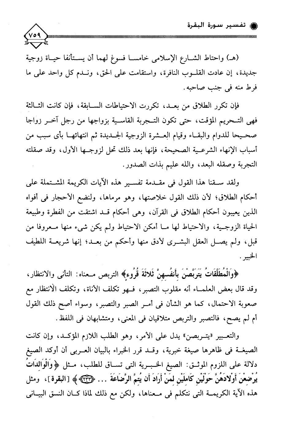 ولقد سقنا هذا القول في مقدمة تفسير هذه الآيات الكريمة المشتملة على أحكام الطلاق، لأن ذلك القول خلاصتها، وهو مرماها، ولنضع الأحجار في أفواه الذين يعيبون أحكام الطلاق في القرآن، وهي أحكام قد اشتقت من الفطرة وطبيعة الحياة الزوجية، والاحتياط لها ما أمكن الاحتياط ولم يكن شيء منها معروفا من قبل، ولم يصل العقل البشرى لأدق منها وأحكم من بعد؛ إنها شريعة اللطيف الخبير.