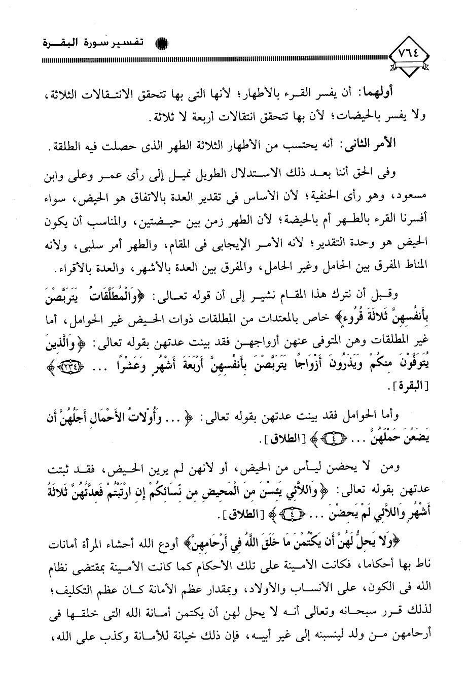 أولهما - أن يفسر " القرء " بالأطهار؛ لأنها التي بها تتحقق الانتقالات الثلاثة، ولا يفسر بالحيضات، لأن بها تتحقق انتقالات أربعة لَا ثلاثة.