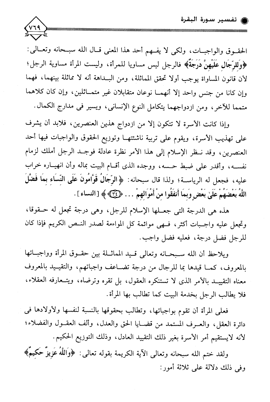 الحقوق والواجبات، ولكي لَا يفهم أحد هذا المعنى قال الله سبحانه وتعالى: (وَلِلرِّجَالِ عَلَيْهِنَّ دَرَجَةٌ) فالرجل ليس مساويا للمرأة، وليست المرأة مساوية الرجل؛ لأن قانون المساواة يوجب أولا تحقق المماثلة، ومن البداهة أنه لَا مماثلة بينهما، فهما وإن كانا من جنس واحد إلا أنهما نوعان متقابلان غير متماثلين، وإن كان كلاهما متمما للآخر، ومن ازدواجهما يتكامل النوع الإنساني، ويسير في مدارج الكمال.