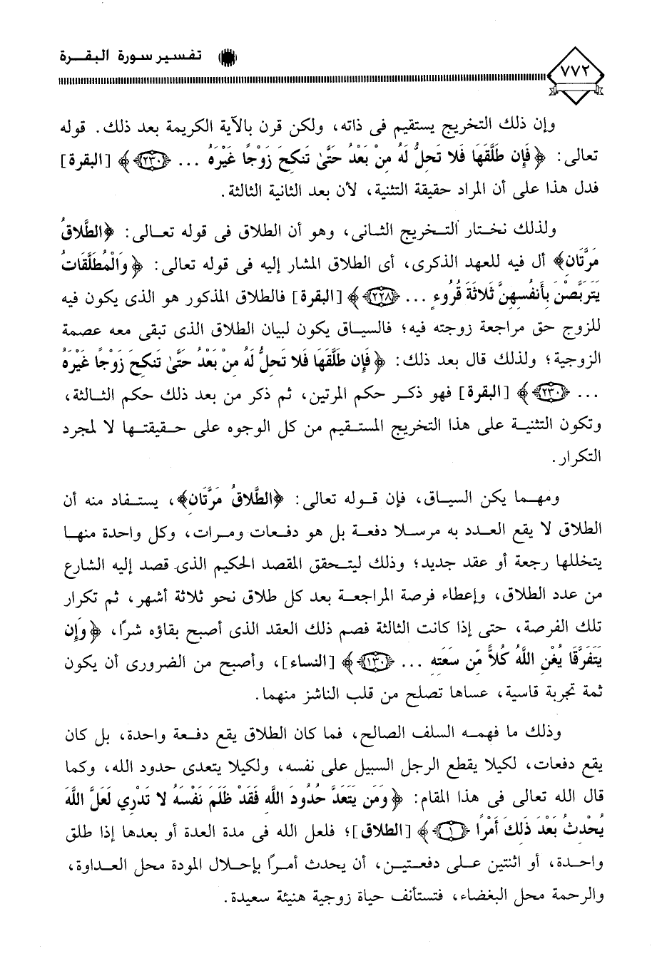 ولذلك نختار التخريج الثاني، وهو أن الطلاق في قوله تعالى: (الطَّلاقُ مَرَّتَانِ) أل فيه للعهد الذكري، أي الطلاق المشار إليه في قوله تعالى: (وَالْمُطَلَّقَاتُ يَتَرَبَّصْنَ بِأَنفُسِهِنَّ ثَلاثَةَ قُرُوءٍ. . .)، فالطلاق المذكور هو الذي يكون فيه للزوج حق مراجعة زوجته فيه " فالسياق يكون لبيان الطلاق الذي تبقى معه عصمة الزوجية، ولذلك قال بعد ذلك: (فَإِن طَلَّقَهَا فَلا تَحِلُّ لَهُ مِنْ بَعْدُ حَتَّى تَنكِحَ زَوْجًا غَيْرَهُ ... )، فهو ذكر حكم المرتين، ثم ذكر من بعد ذلك حكم الثالثة، وتكون التثنية على هذا التخريج المستقيم من كل الوجوه على حقيقتها لَا لمجرد التكرار.