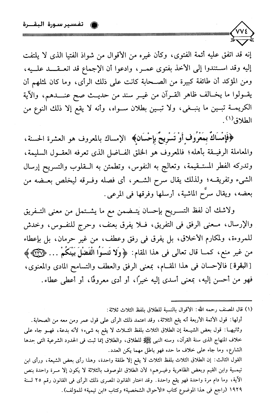 (فَإِمْسَاكٌ بِمَعْرُوفٍ أَوْ تَسْرِيحٌ بِإِحْسَانٍ) الإمساك بالمعروف هو العشرة الحسنة، والمعاملة الرفيقة بأهله؛ فالمعروف هو الخلق الفاضل الذي تعرفه العقول السليمة، وتدركه الفطر المستقيمة، وتعالج به النفوس، وتطمئن به القلوب والتسريح إرسال الشيء وتفريقه؛ ولذلك يقال سرح الشعر، أي فصله وفرقه ليخلص بعضه من بعضه، ويقال سرَّح الماشية، أرسلها وفرقها في المرعى.