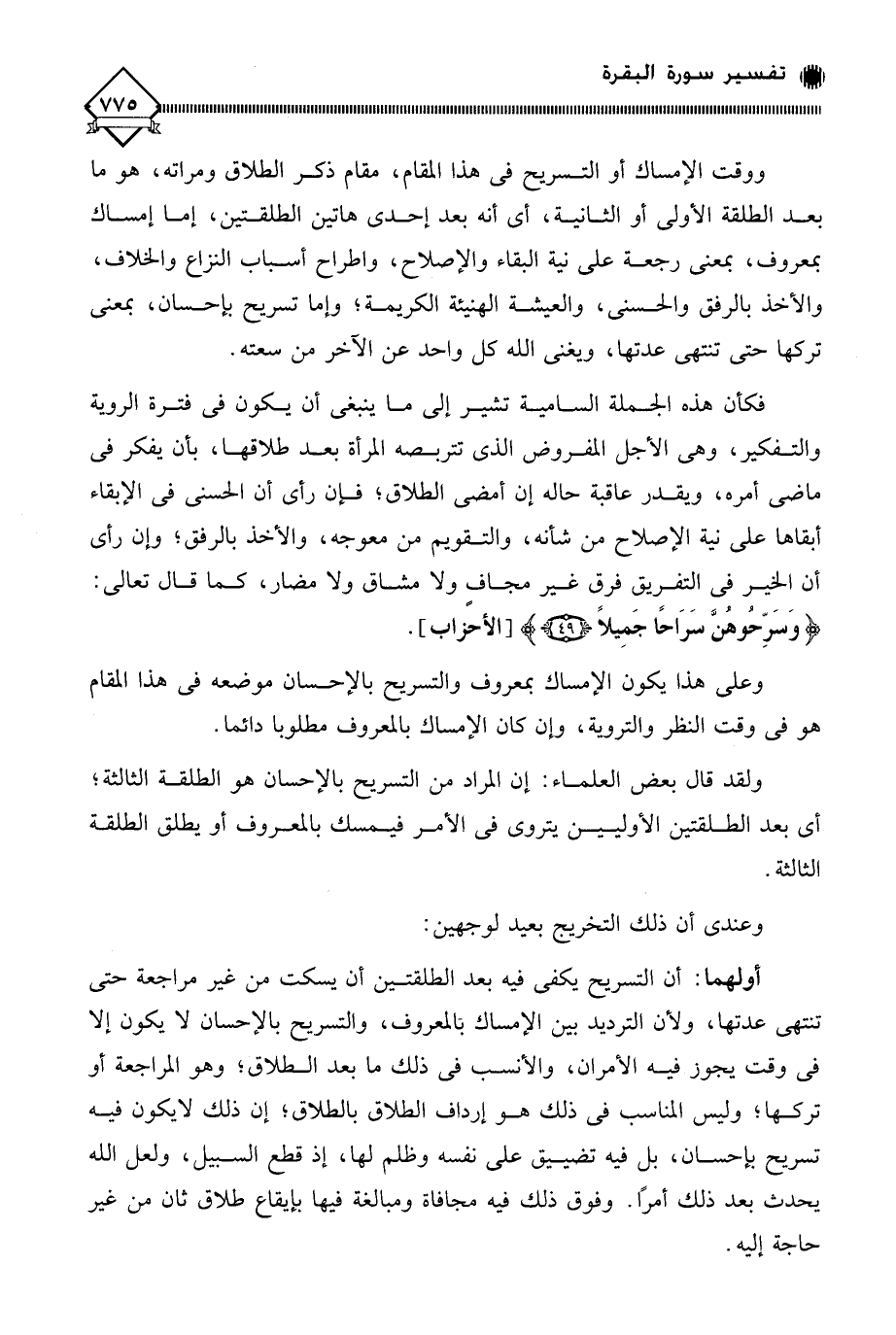 أولهما: أن التسريح يكفي فيه بعد الطلقتين أن يسكت من غير مراجعة حتى تنتهي عدتها، ولأن الترديد بين الإمساك بالمعروف، والتسريح بالإحسان لَا يكون إلا في وقت يجوز فيه الأمران، والأنسب في ذلك ما بعد الطلاق، وهو المراجعة أو تركها، وليس المناسب في ذلك هو إرداف الطلاق بالطلاق، إن ذلك لَا يكون فيه تسريح بإحسان، بل فيه تضييق على نفسه وظلم لها، إذ قطع السبيل، ولعل الله يحدث بعد ذلك أمرًا. وفوق ذلك فيه مجافاة ومبالغة فيها بإيقاع طلاق ثان من غير حاجة إليه.